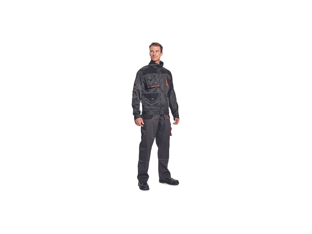 • pánská pracovní bunda • vyztužená ramena • 2 velké kapsy • 2 náprsní kapsy na suchý zip • 1 kapsa na rukávu • zapínání kryté légou • elastický obvod pasu a konce rukávů • reflexní prvky