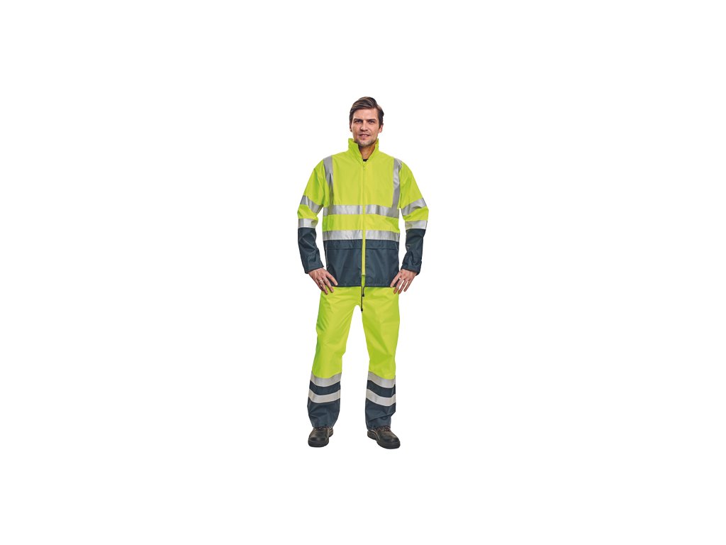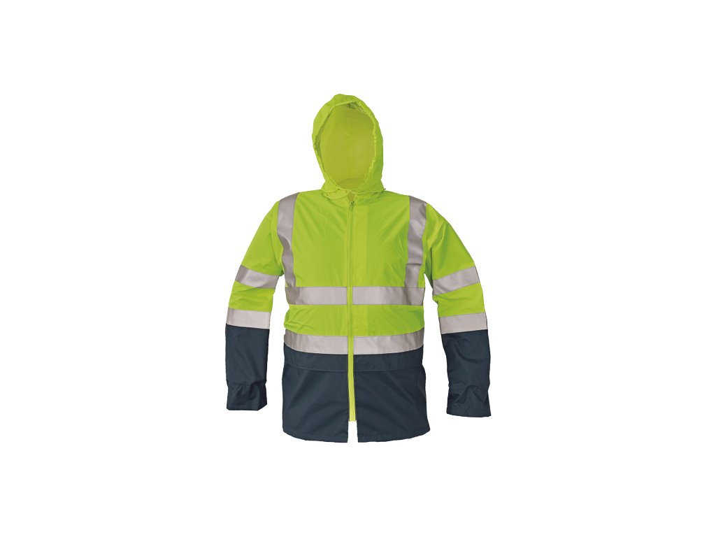 • pánská HI-VIS bunda bez podšívky s kapucí skrytou v límci, podlepené švy • vysoká voděodolnost, paropropustná • reflexní 3M pruhy přes ramena, po obvodu boků a rukávů • 2 velké přední kapsy kryté klopou • spodní lem bundy a kapuce stažitelná na tkaničku