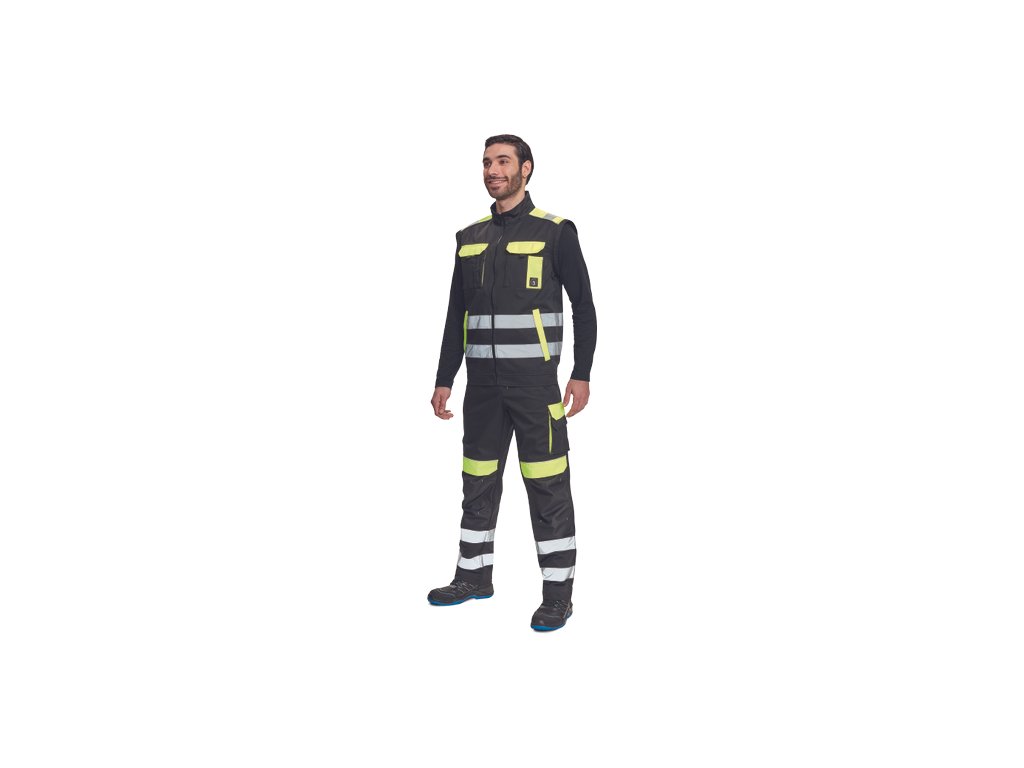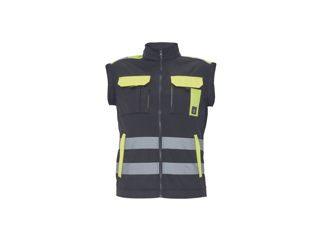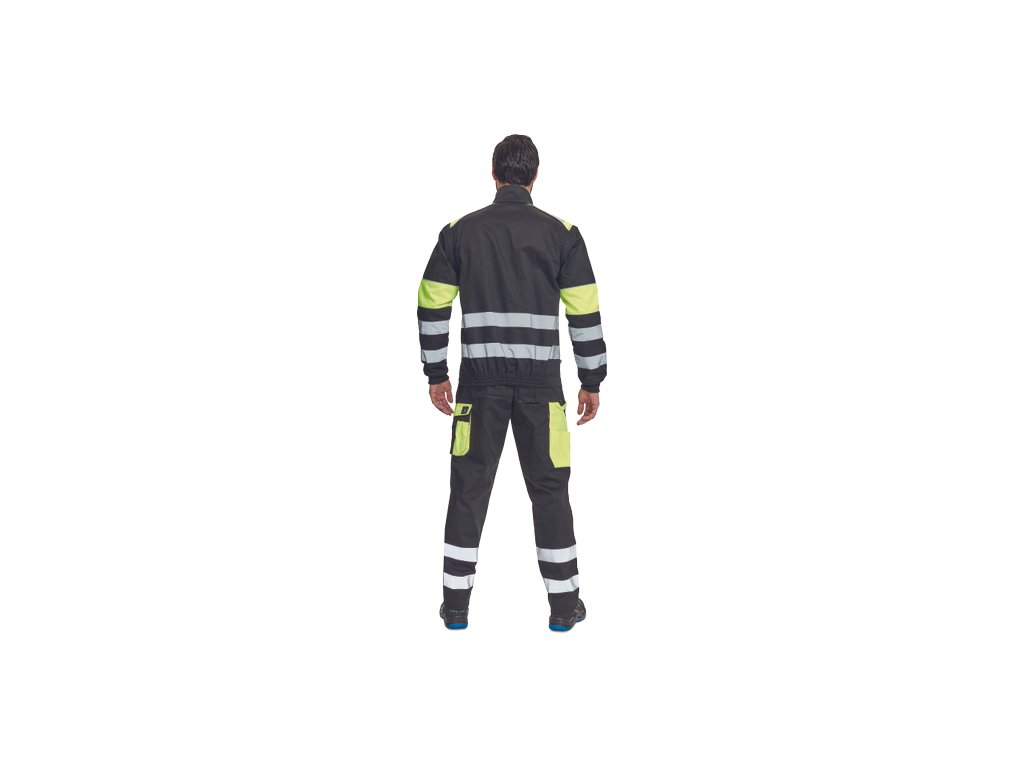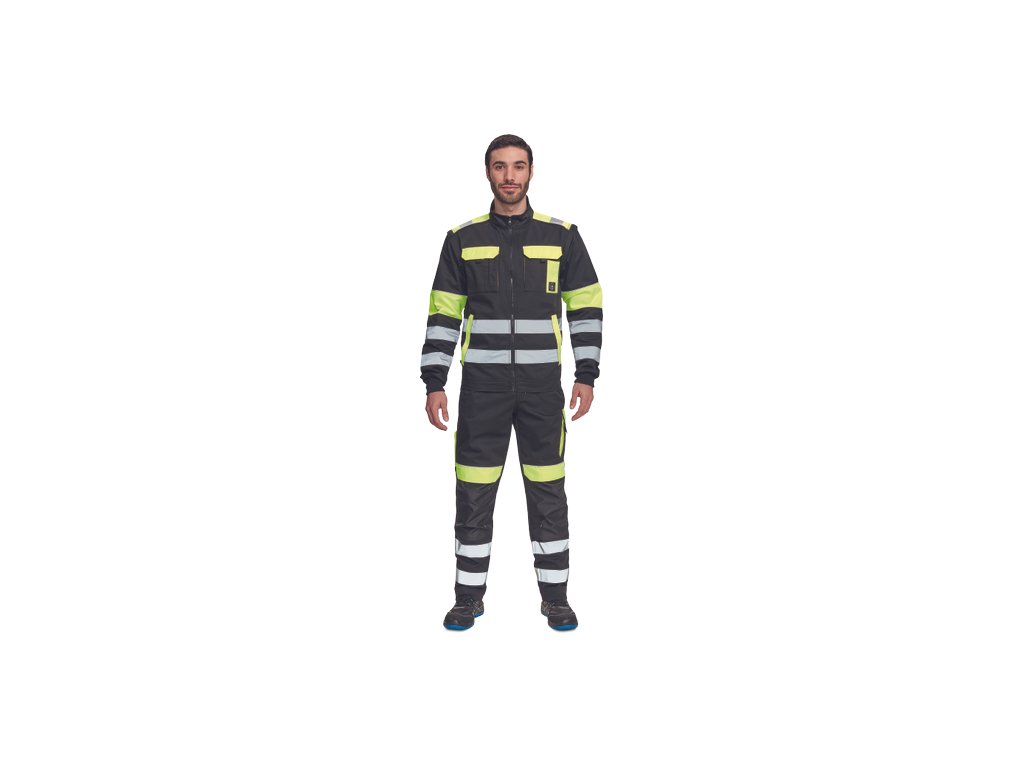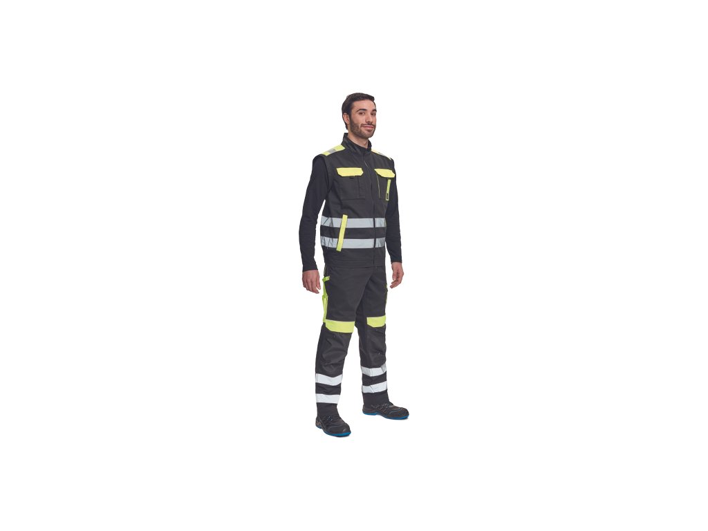 • pánská reflexní pracovní bunda se zapínáním na zip • odepínatelné rukávy • 2 přední kapsy • 2 náprsní kapsy • zesílení namáhaných míst ramen a loktů • dvojice našitých 5 cm reflexních pruhů přes spodní obvod pasu a rukávů • 2 menší pruhy přes ramena • reflexní paspulky lemující zesílené části rukávů a ramen • pružné náplety manžet rukávů a elastický spodní obvod pasu