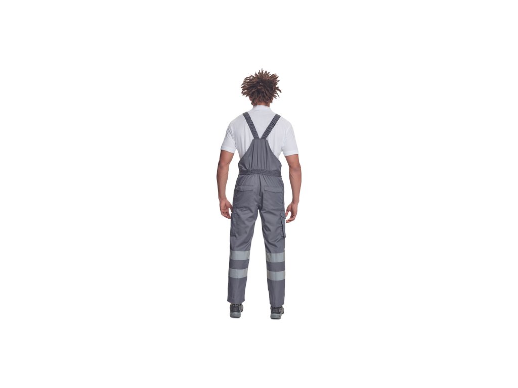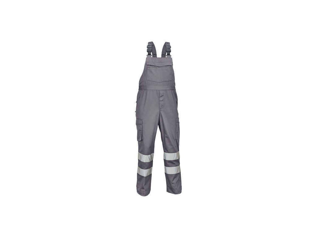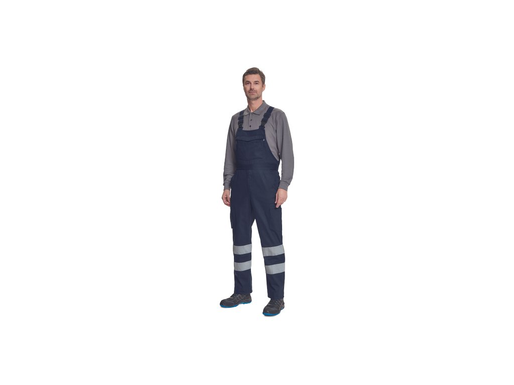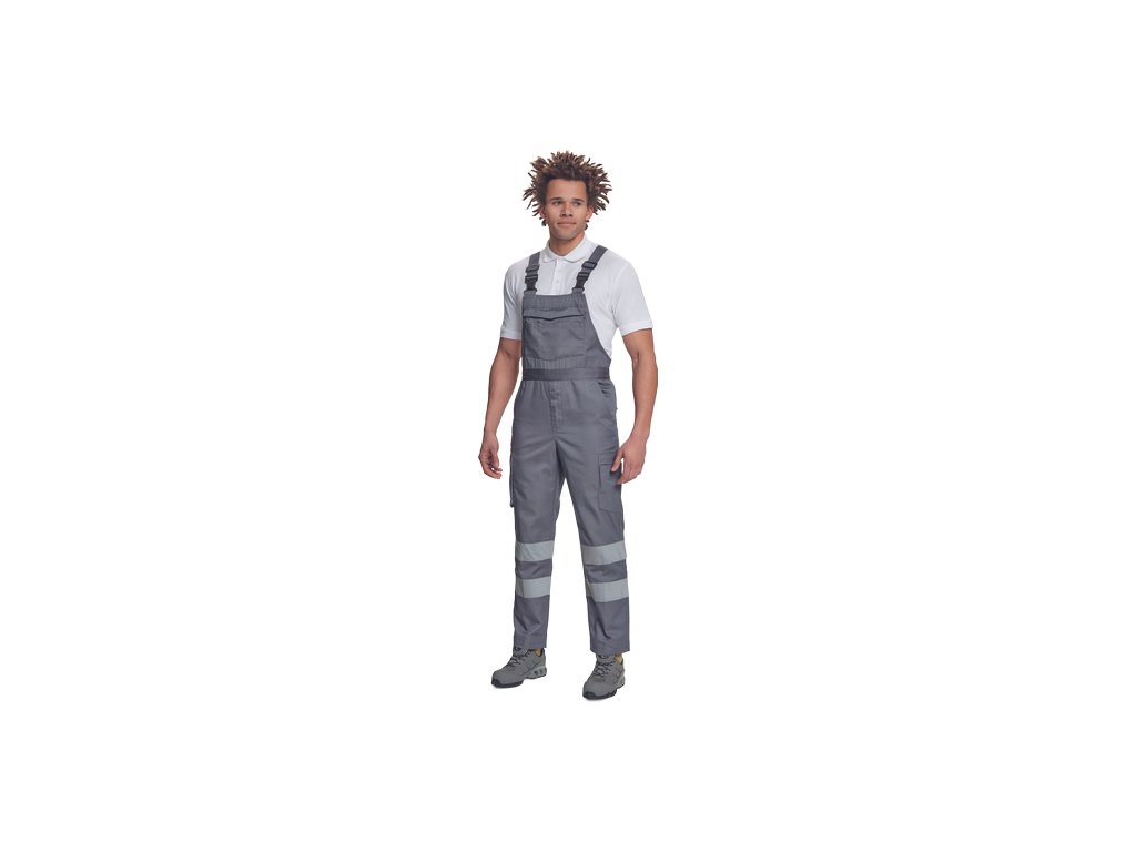 • pánské lehké pracovní kalhoty s laclem a reflexními pruhy na nohavicích, elastický pas • 2 boční kapsy, 1 kapsička na mince • 2 multifunkční stehenní kapsy, 2 zadní kapsy • 1 velká multifunkční náprsní kapsa • elastické šle se zapínáním na sponu • nastavitelná délka nohavic