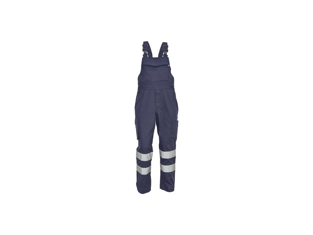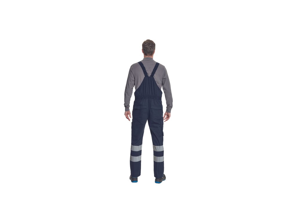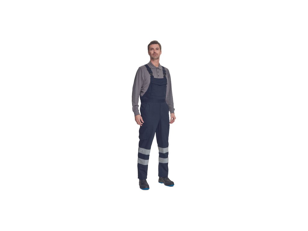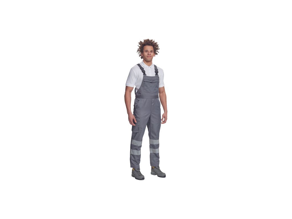 • pánské lehké pracovní kalhoty s laclem a reflexními pruhy na nohavicích, elastický pas • 2 boční kapsy, 1 kapsička na mince • 2 multifunkční stehenní kapsy, 2 zadní kapsy • 1 velká multifunkční náprsní kapsa • elastické šle se zapínáním na sponu • nastavitelná délka nohavic