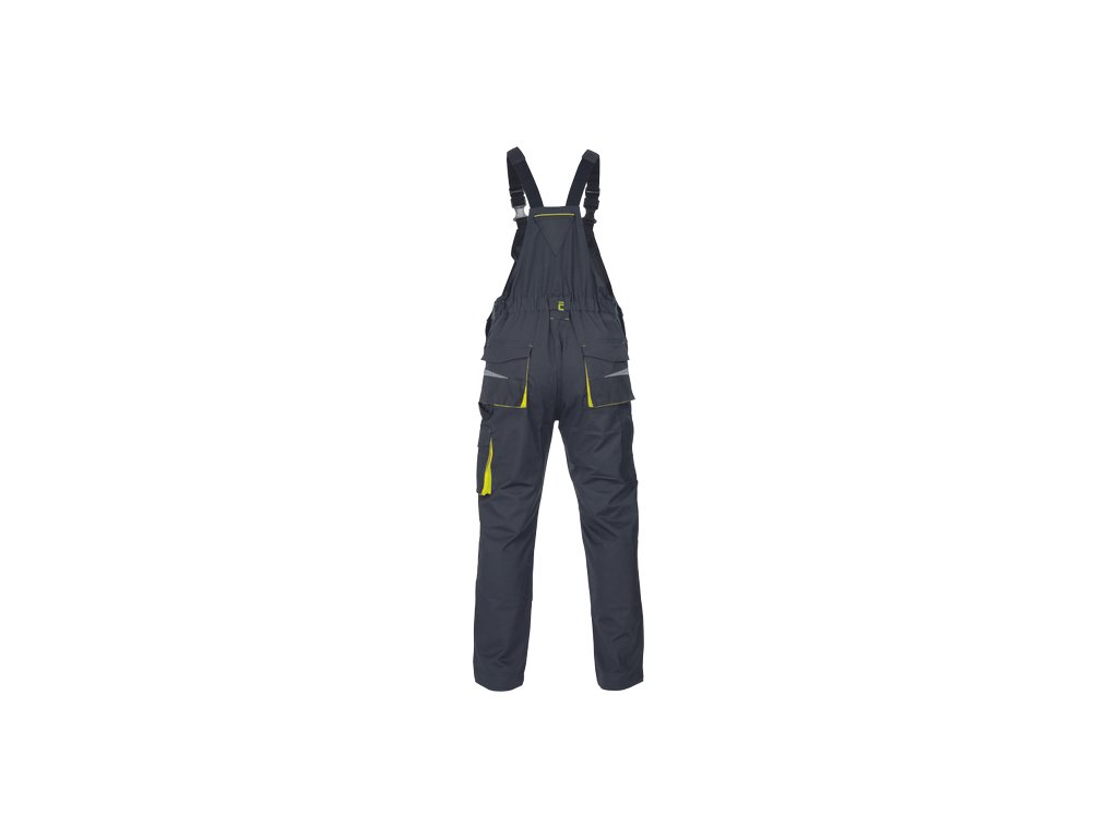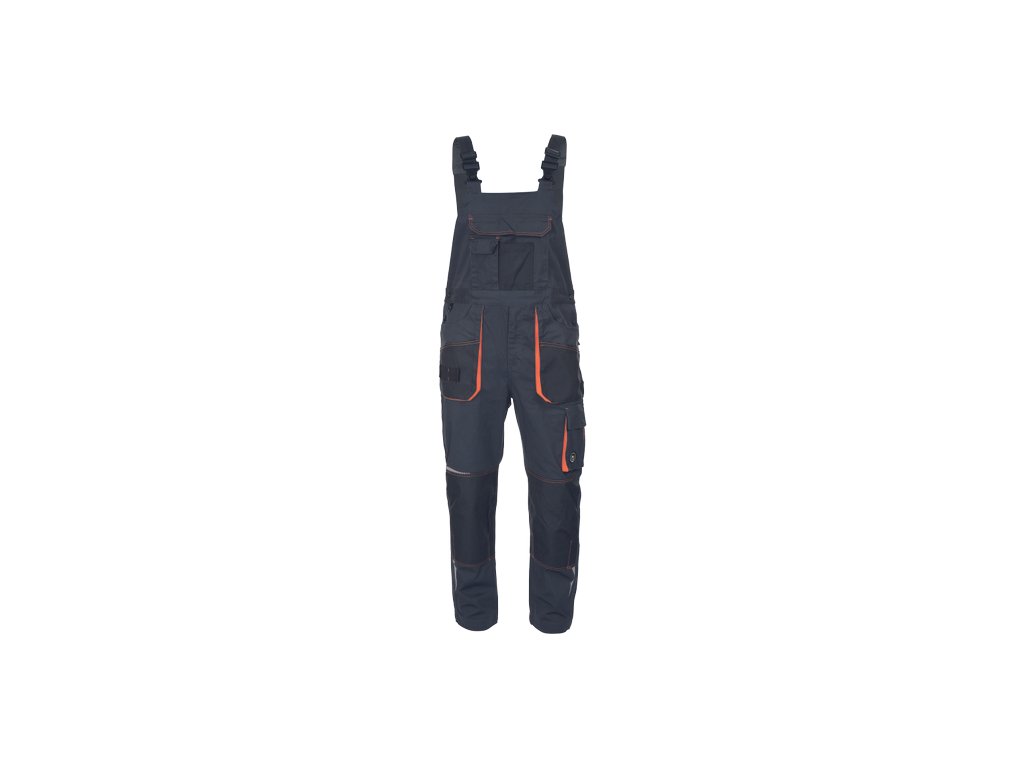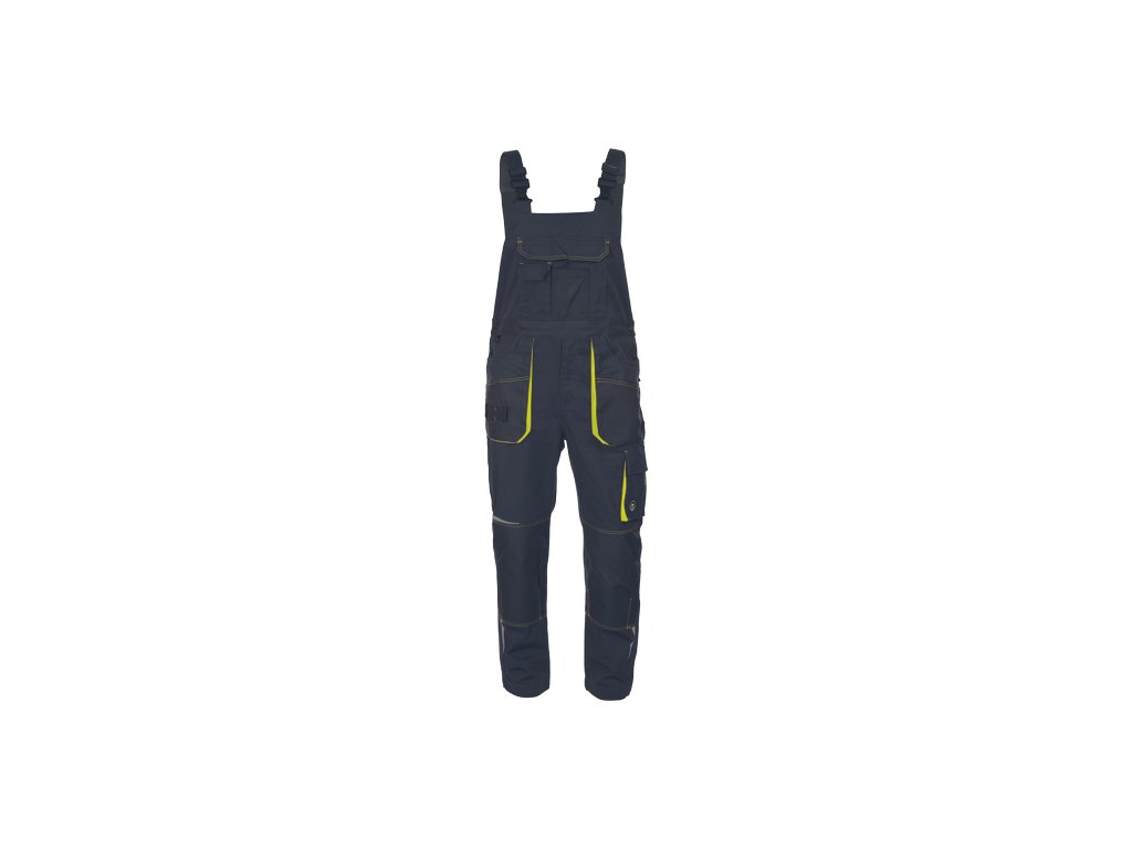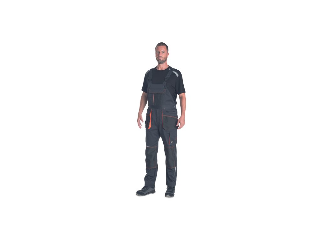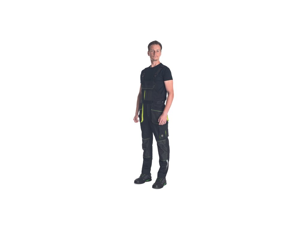 • pánské pracovní vysoce odolné strečové kalhoty s laclem • elastický pas • multifunkční kapsy • 1 velká náprsní kapsa • Oxford 600D zesílení kolenních kapes pro vložení chráničů kolen • tištěné reflexní segmentové detaily • nastavitelná délka nohavic