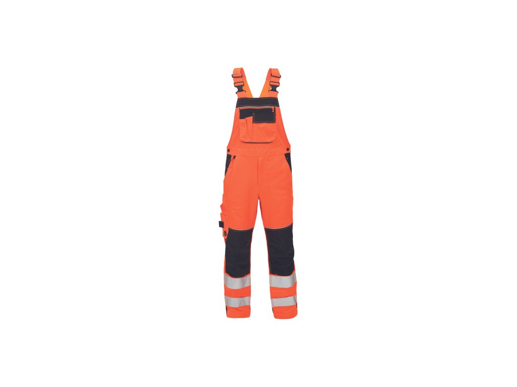 • pánské HI-VIS pracovní kalhoty s laclem • dvojice tištěných 7,5 cm reflexních pruhů • elastický pas • 6 funkčních kapes • 600D Oxford zesílení v oblasti kolen s možností vkládání kolenních výztuh • dekorativní prošití v kontrastní HI-VIS barvě • nastavitelné délka nohavic