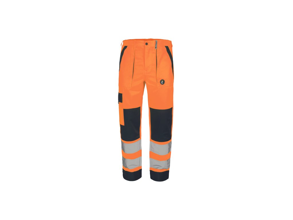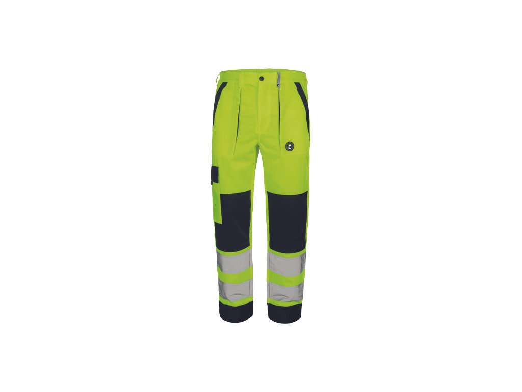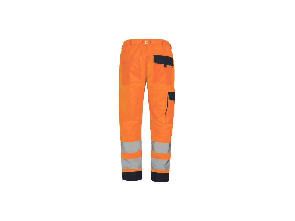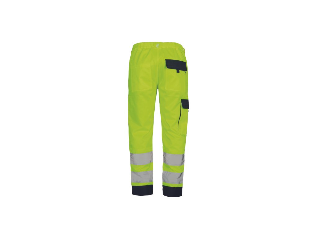 • pánské HI-VIS pracovní kalhoty s elastickým pasem • 2 přední kapsy • 1 stehenní kapsa • 2 zadní kapsy se zapínáním na suchý zip • 2 šité 7,5 cm široké reflexní pruhy na spodních částech nohavic • zesílená oblast kolen • nastavitelná délka nohavic