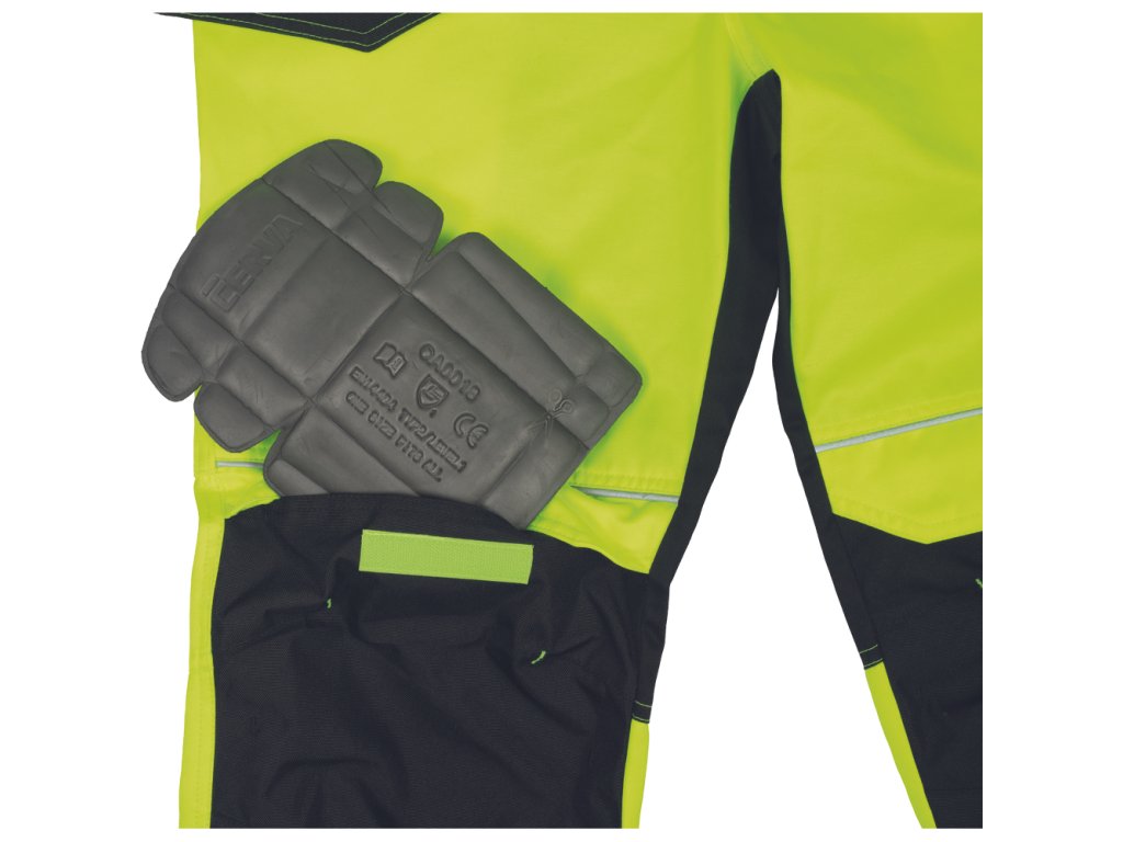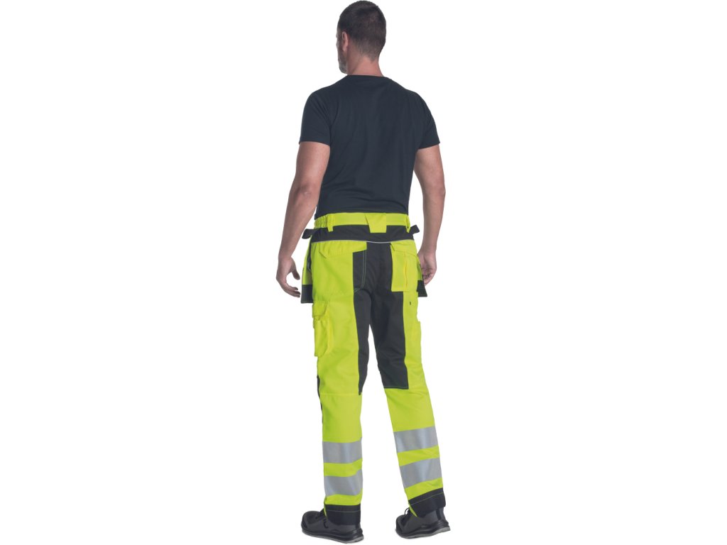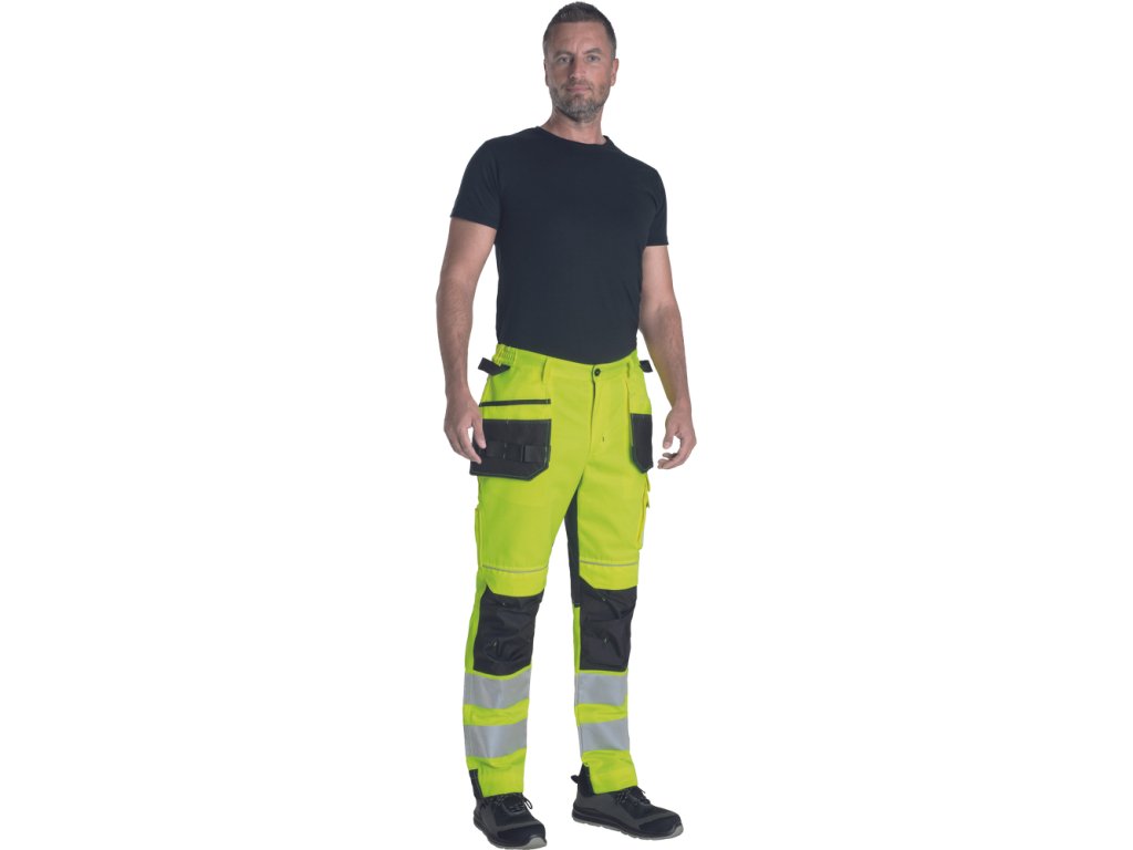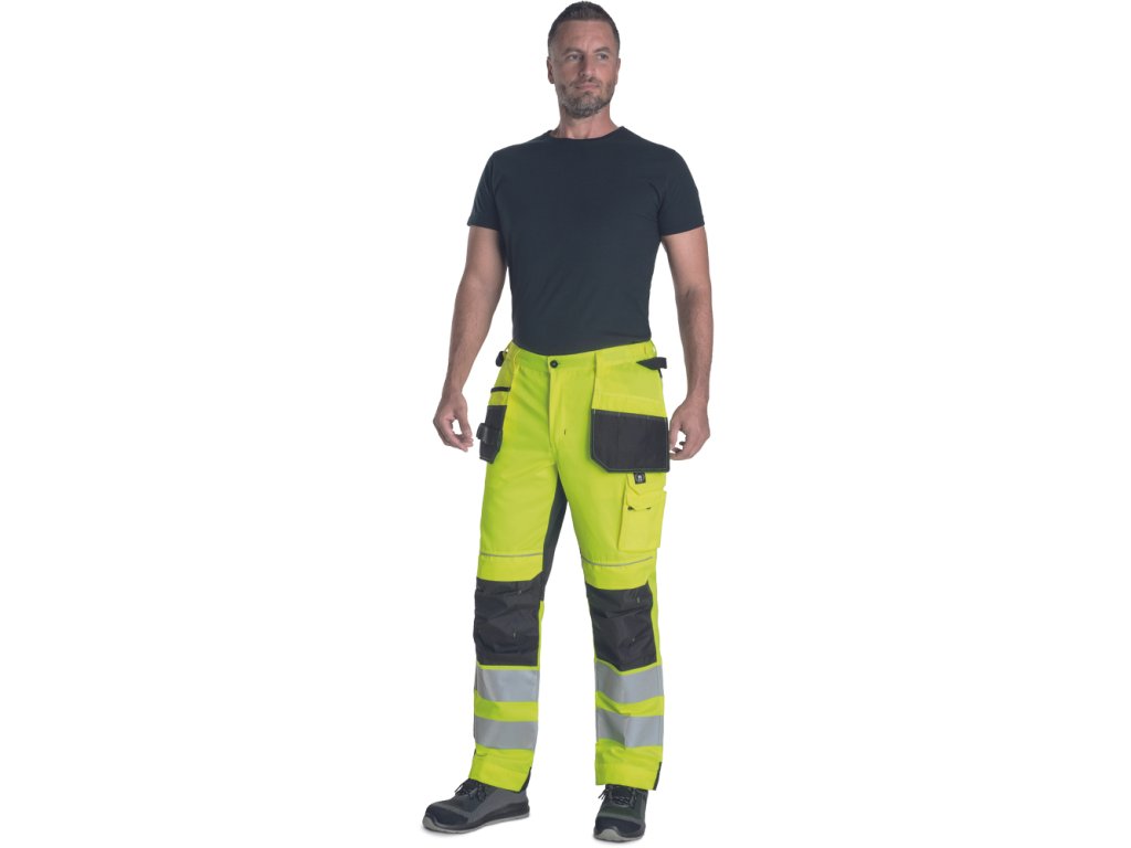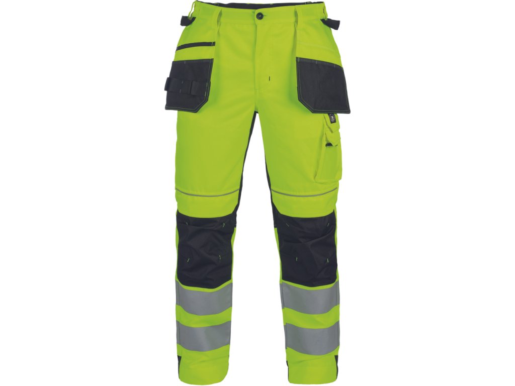 • pánské pracovní HI-VIS kalhoty s elastickým pasem • 2 multifunkční létací kapsy • 2 tištěné 7,5 cm široké reflexní pruhy na spodních nohavicích • zesílení kolenních částí Oxford 600D s možností vložení chráničů kolen • možnost prodloužení délky nohavic