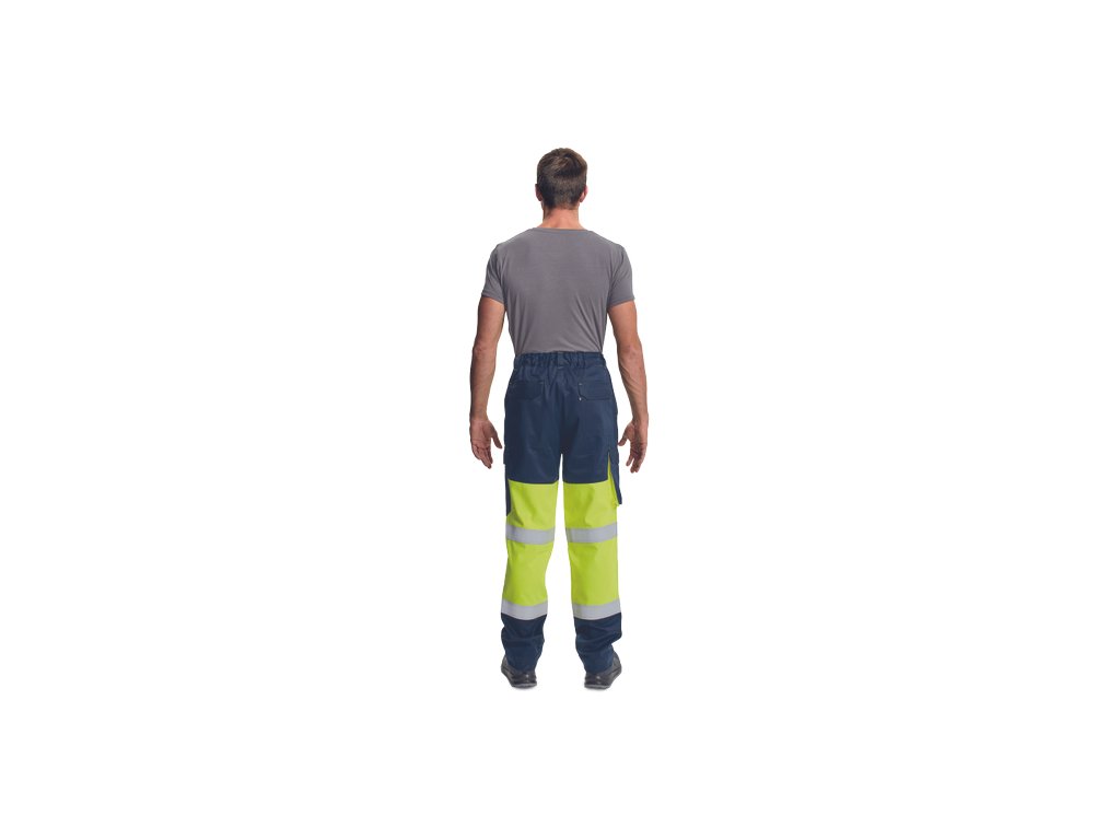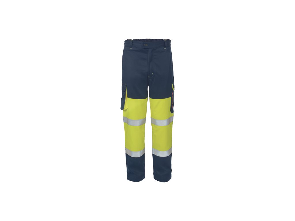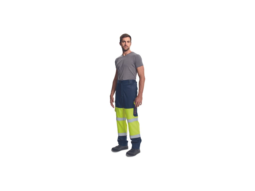 • pánské HI-VIS multinormní kalhoty s elastickým pasem • 2 boční kapsy • 2 stehenní kapsy s klopou na suchý zip • 2 zadní kapsy na suchý zip • dvojice 5 cm šitých reflexních pruhů okolo lýtek • nastavitelná délka nohavic