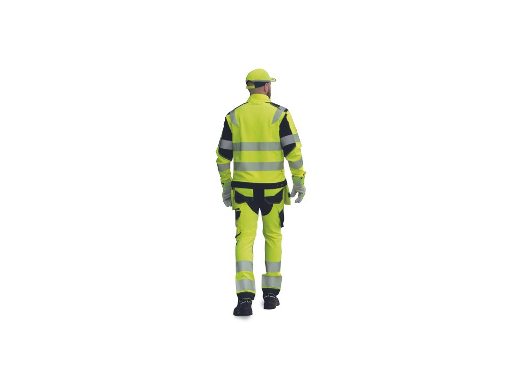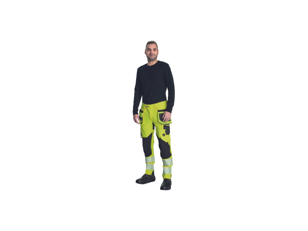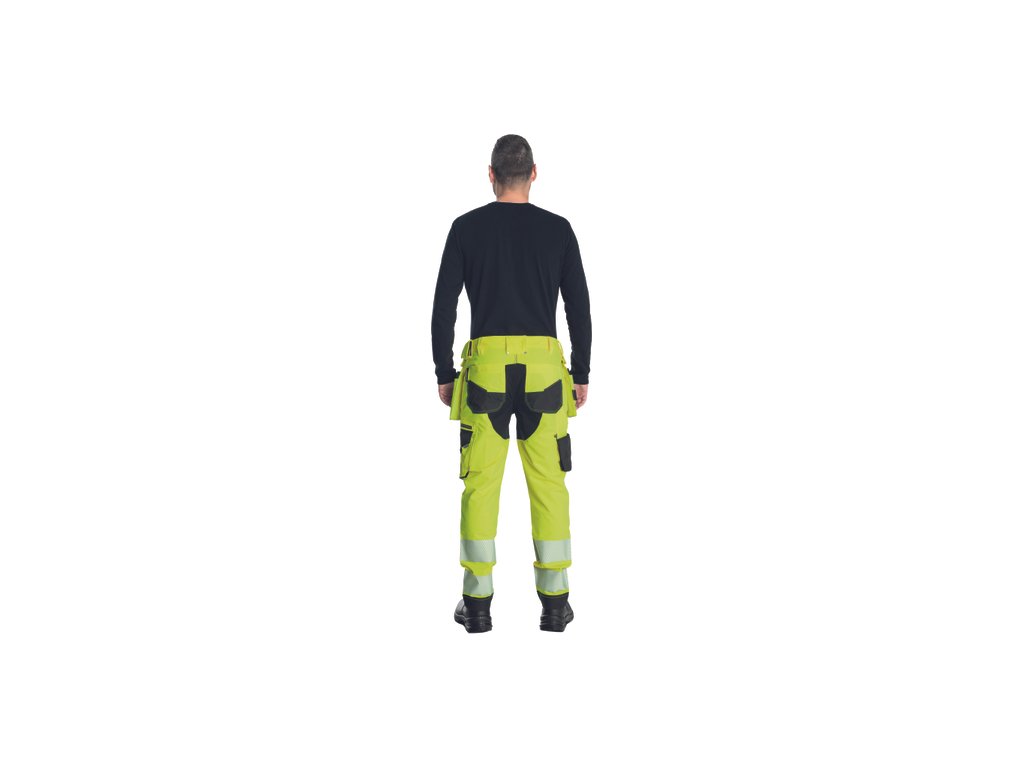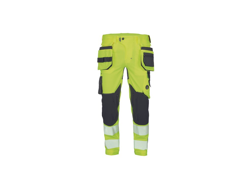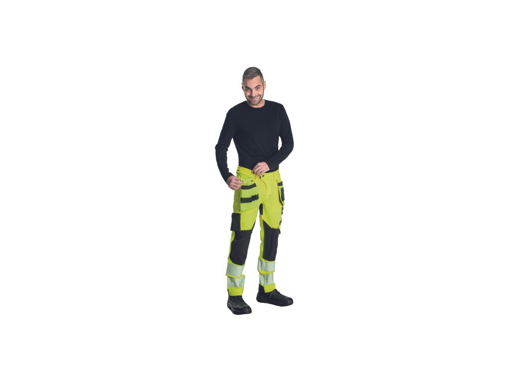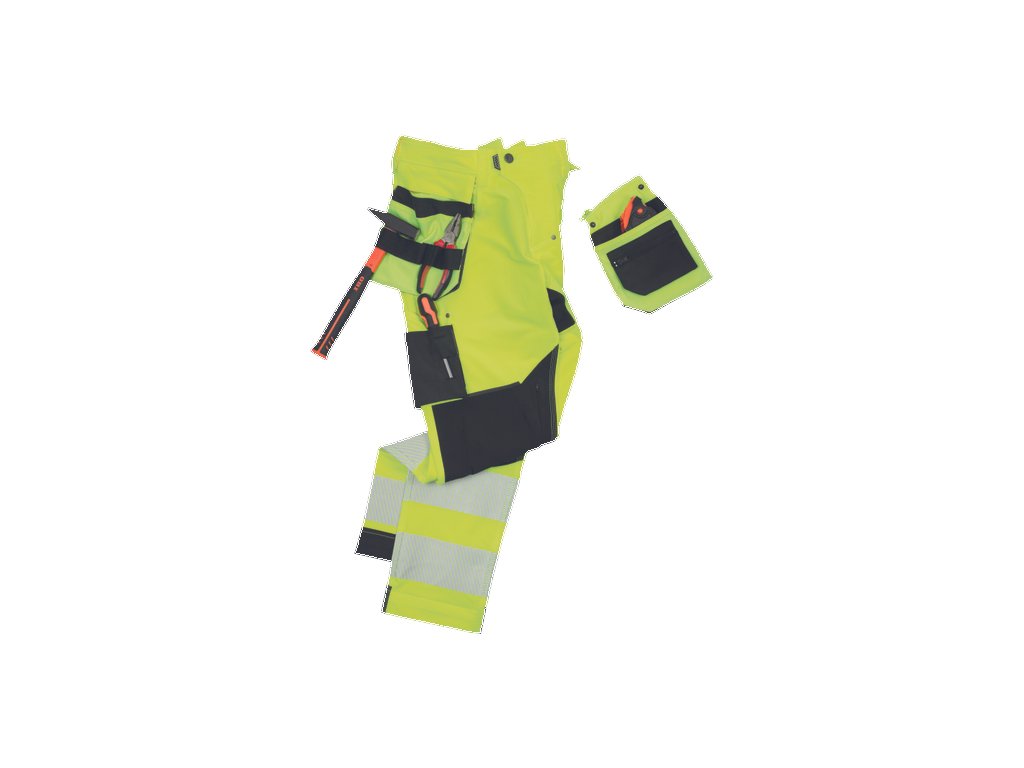 • pánské HI-VIS pracovní kalhoty s pružným pasem doplněné o 2 boční odepínatelné multifunkční "létající" kapsy • 2 zadní kapsy se zapínáním na suchý zip • 2 multifunkční stehenní kapsy • elastický inovativní materiál TRIFIBETEX VIS® • odolné trojité prošití nohavic a sedu • CORDURA® zesílení v oblasti kolen s možností vkládání kolenních výztuh • 7,5 cm široké tištěné segmentované reflexní pruhy • reflexní prvky v barevném odstínu • nastavitelná délka nohavic