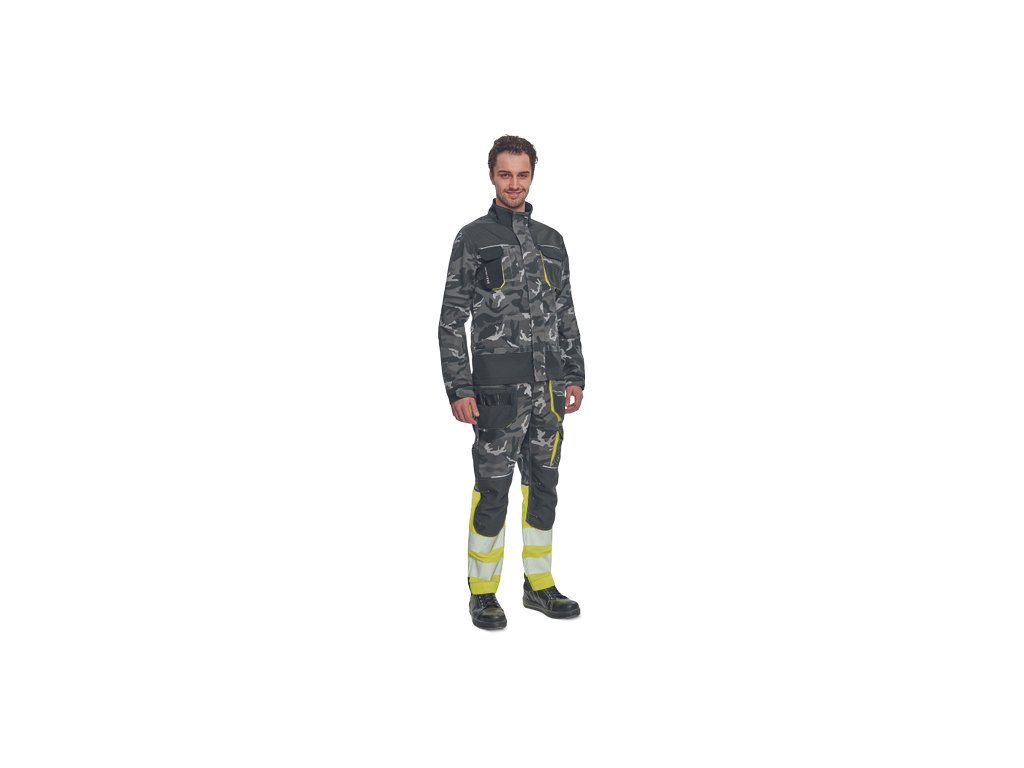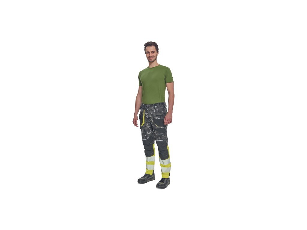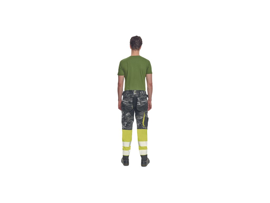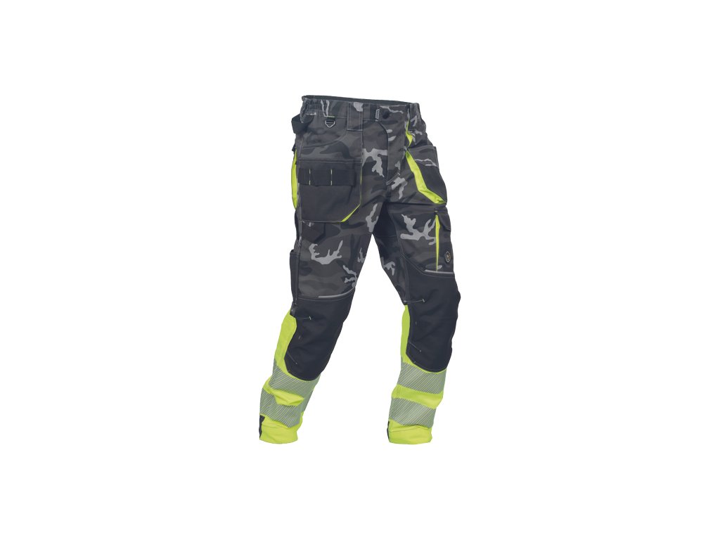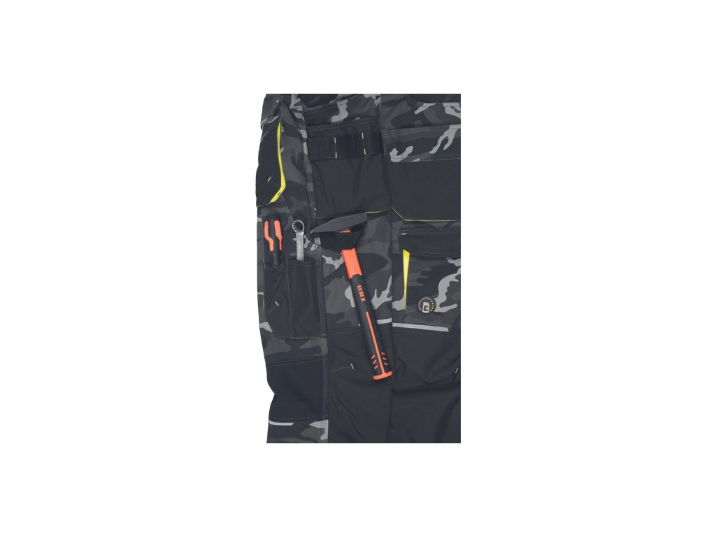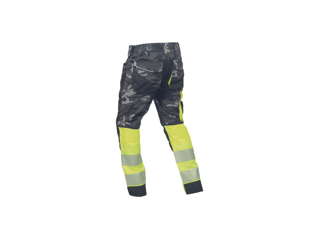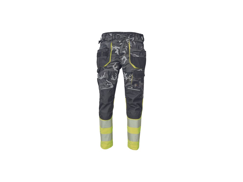 • pánské pracovní HI-VIS kalhoty s pružným pasem a multifunkčními kapsami • v moderní úpravě šedé kamuflážové barvy • Oxford 600D zesílení kolenních kapes pro vkládání ochranných nákoleníků • odolné trojité prošití nohavic a sedu • 2 tištěné reflexní segmentované 7 cm pruhy na spodní části nohavic • nastavitelná délka nohavic