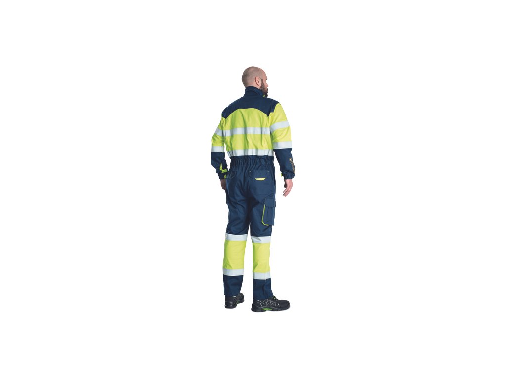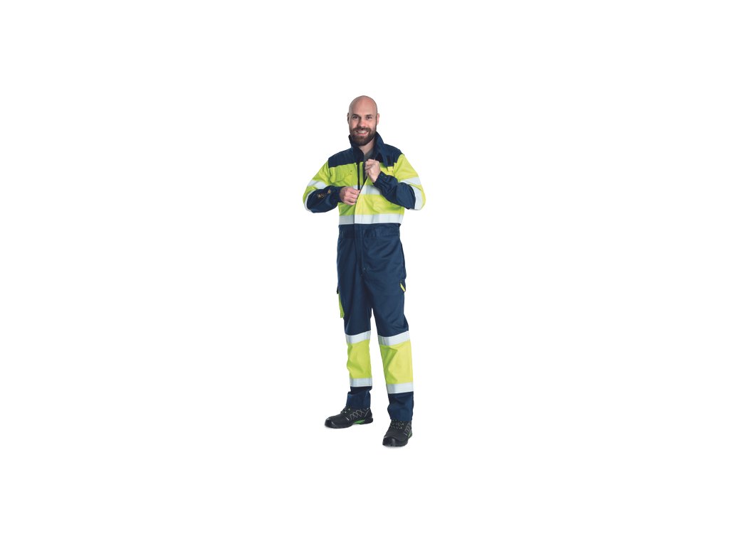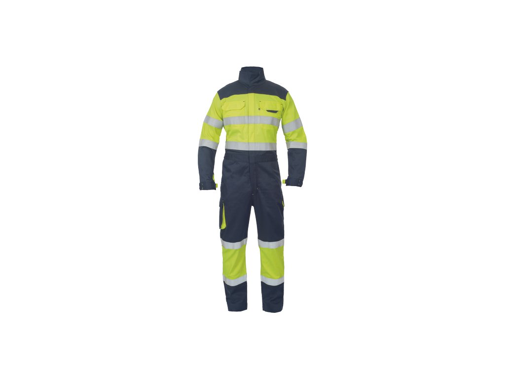 • pánská HI-VIS multinormní kombinéza s elastickým pasem • zapínání na zip kryté légou na suchý zip • 2 boční kapsy • 2 stehenní kapsy s klopou na suchý zip • 2 náprsní kapsy na suchý zip • 2 zadní kapsy na suchý zip • dvojice 5 cm šitých reflexních pruhů okolo rukávů, boků a lýtek • elastické manžety rukávů se suchým zipem • nastavitelná délka nohavic