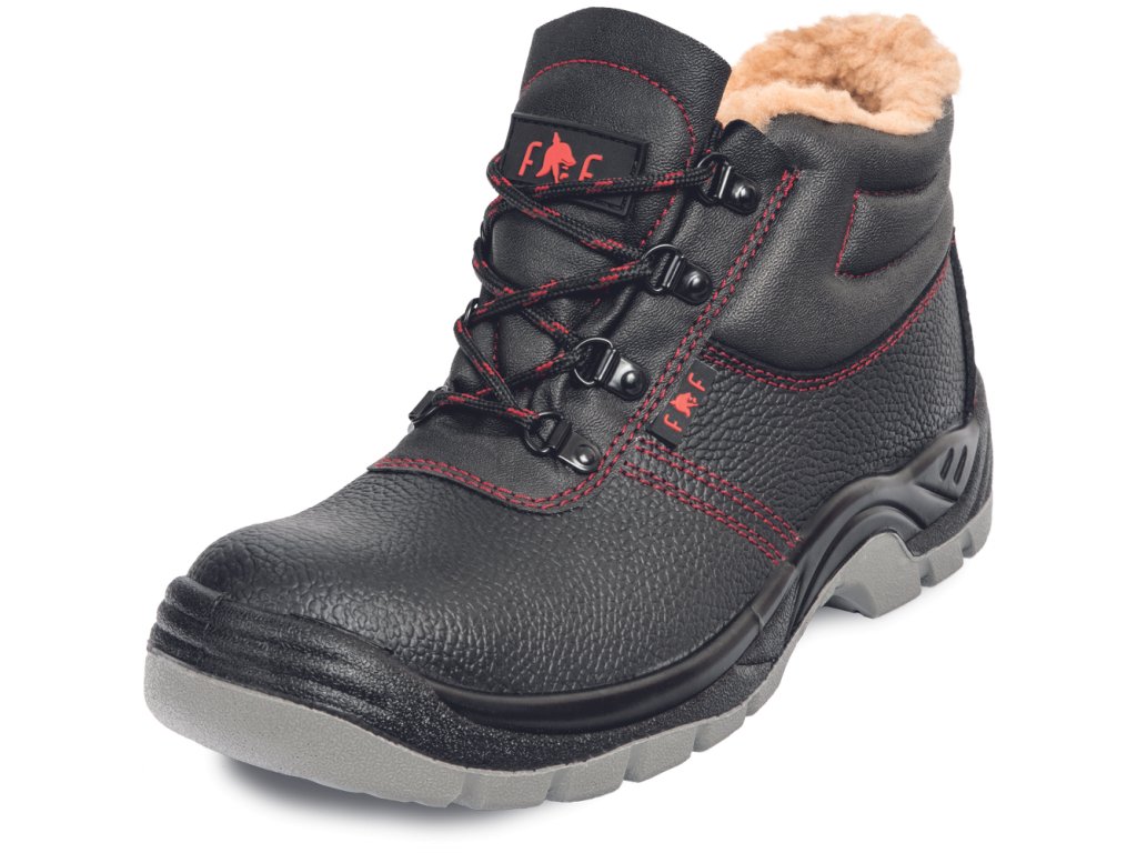 • bezpečnostní kotníková obuv s ocelovou tužinkou, zateplené umělým kožíškem • PU/PU podrážkou, rezistentní olejům • svršek – reliéfní štípaná kůže