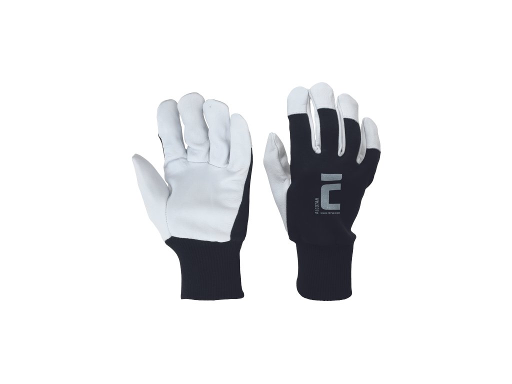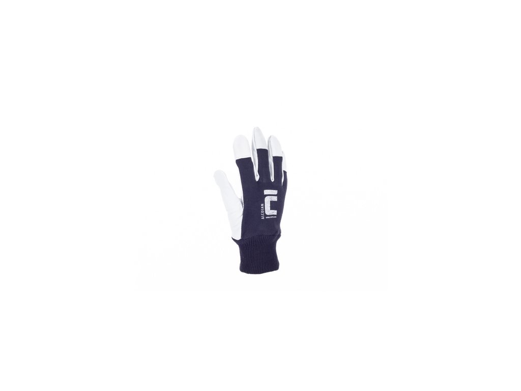 • rukavice z lícové kozinky v dlani • bavlněná tkanina na hřbetu, s překrytými špičkami prstů • náplet na zápěstí