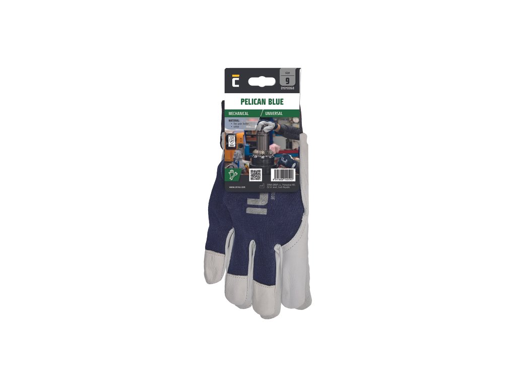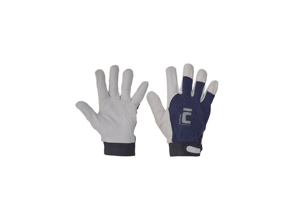 • rukavice šité z jemné lícové ovčiny v dlani • modré bavlněné tkaniny na hřbetu • manžeta na suchý zip