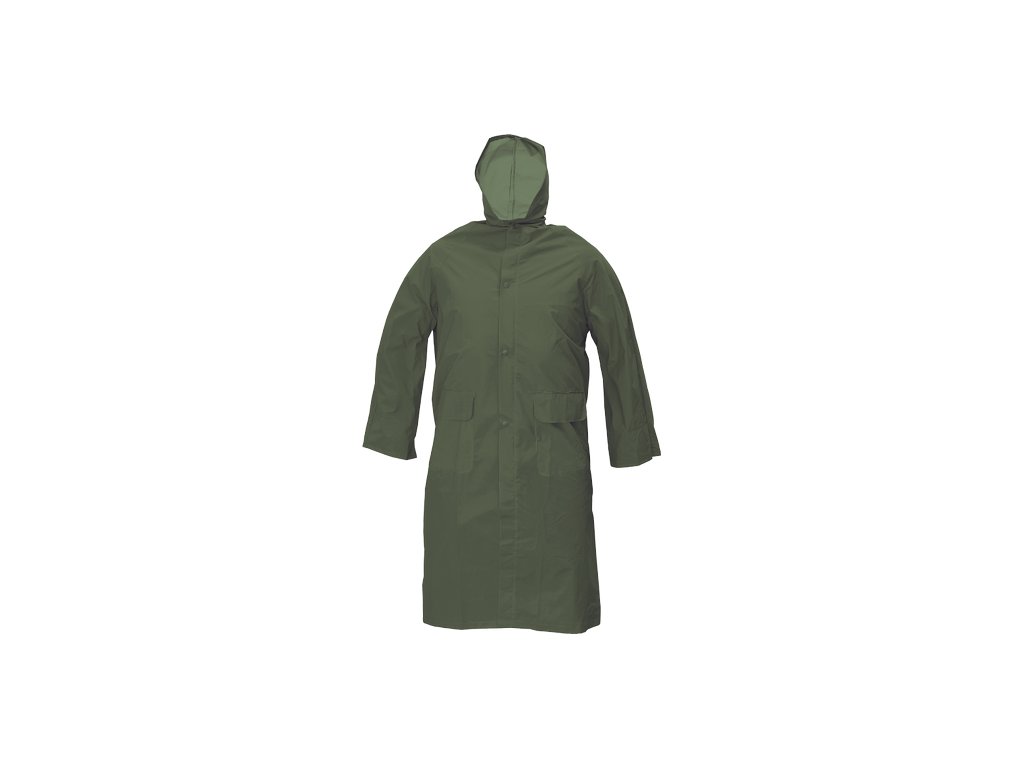 • voděodolný ¾ plášť s kapucí, prodloužená délka • všechny spojovací švy jsou zatavené • materiál s nánosem PVC • dvě přední kapsy kryté légami proti průniku vody • vnitřní manžeta na gumu • ventilace na zádech a v podpaží