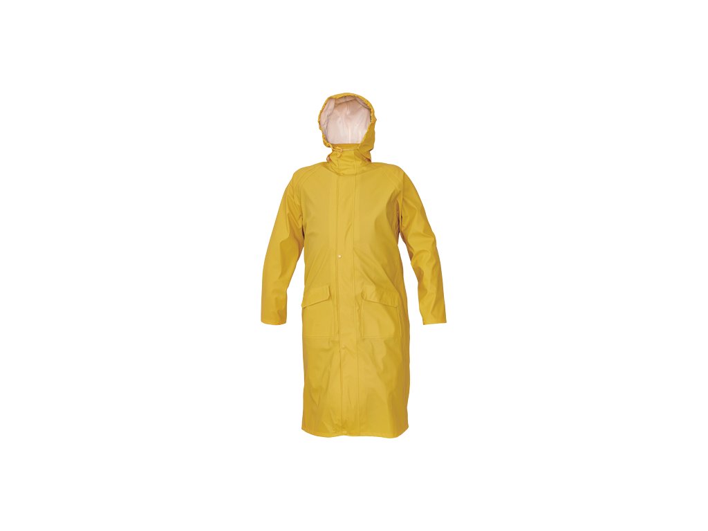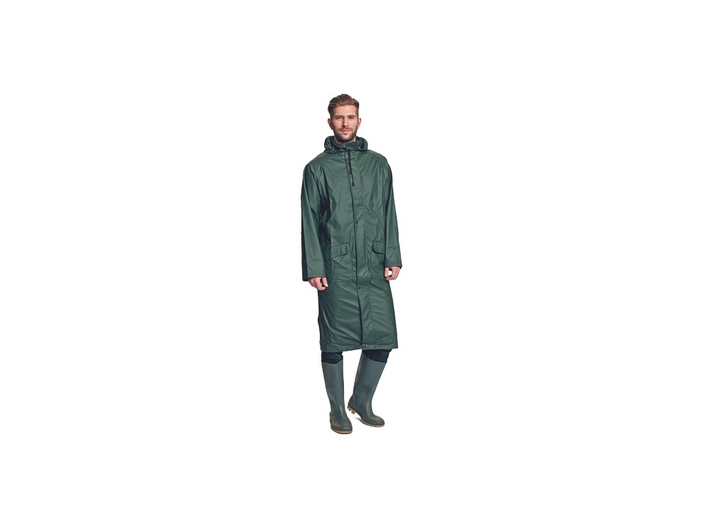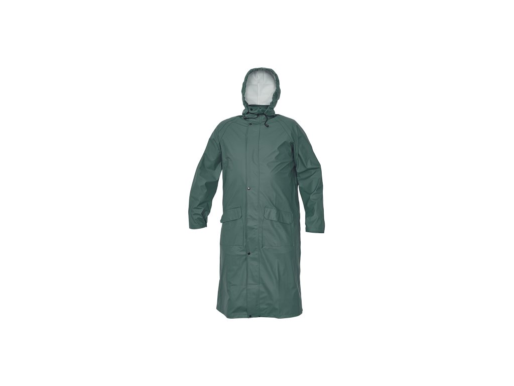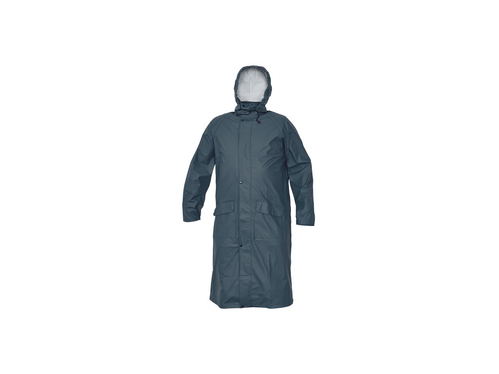 • nepromokavý a větruodolný prodloužený plášť s kapucí v límci, délka 120 cm • zapínání na oboustranný zip krytý légou s druky • obvod kapuce lze stáhnout na tkaničku • dvě přední kapsy kryté légami • spodní lem rukávů lze upravit drukem