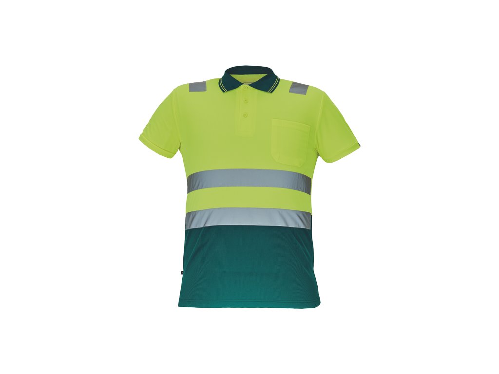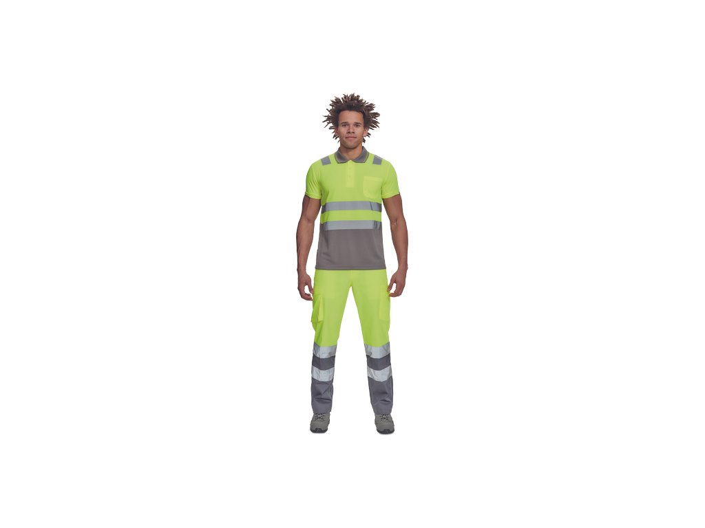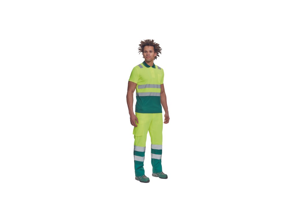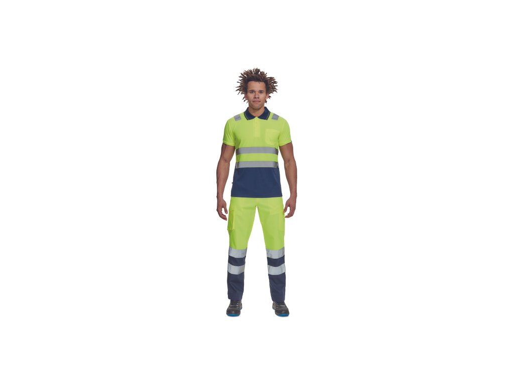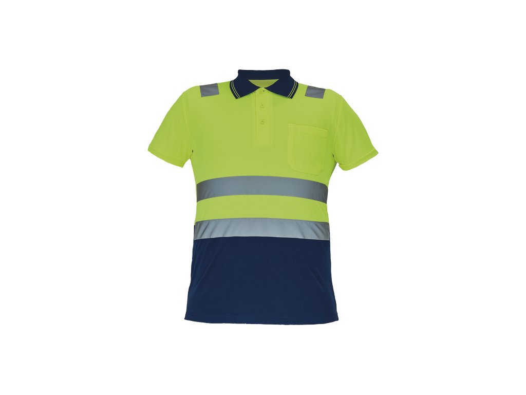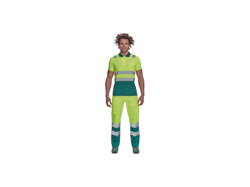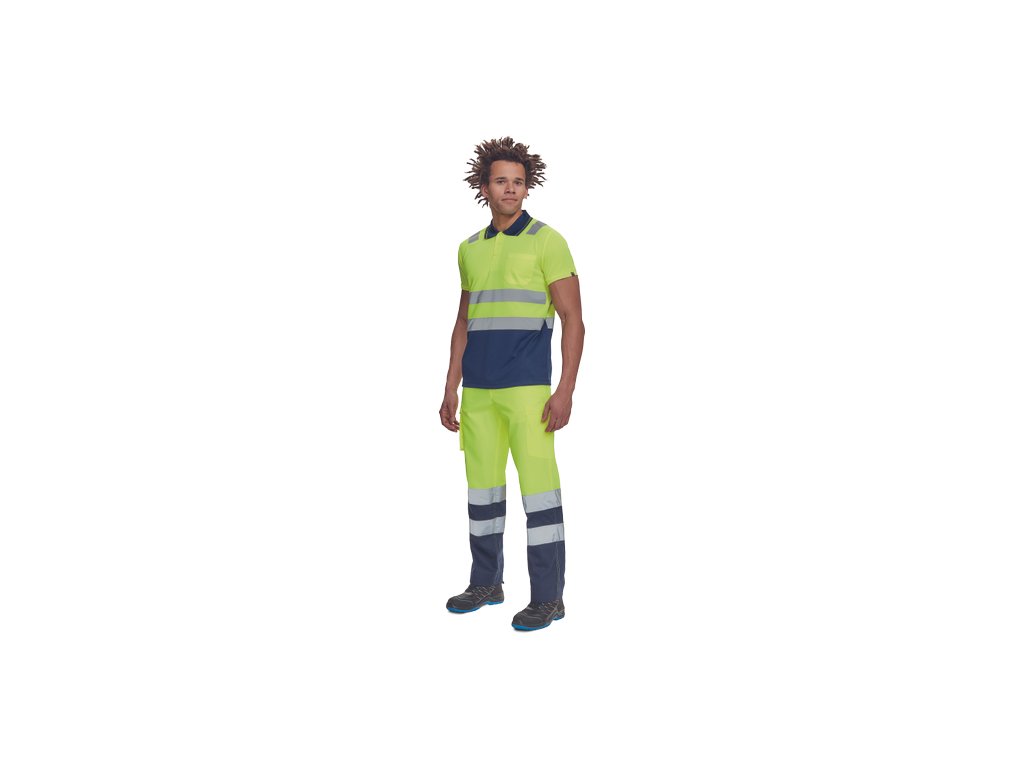 • pánská full HI-VIS polokošile s reflexními pruhy přes ramena a v bocích • zapínání na 3 knoflíky • 1 náprsní kapsička • žebrovaný límeček a lemy rukávů