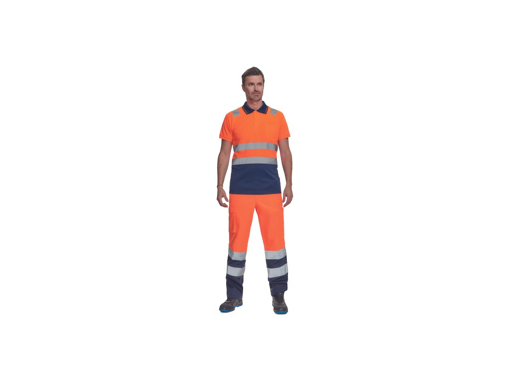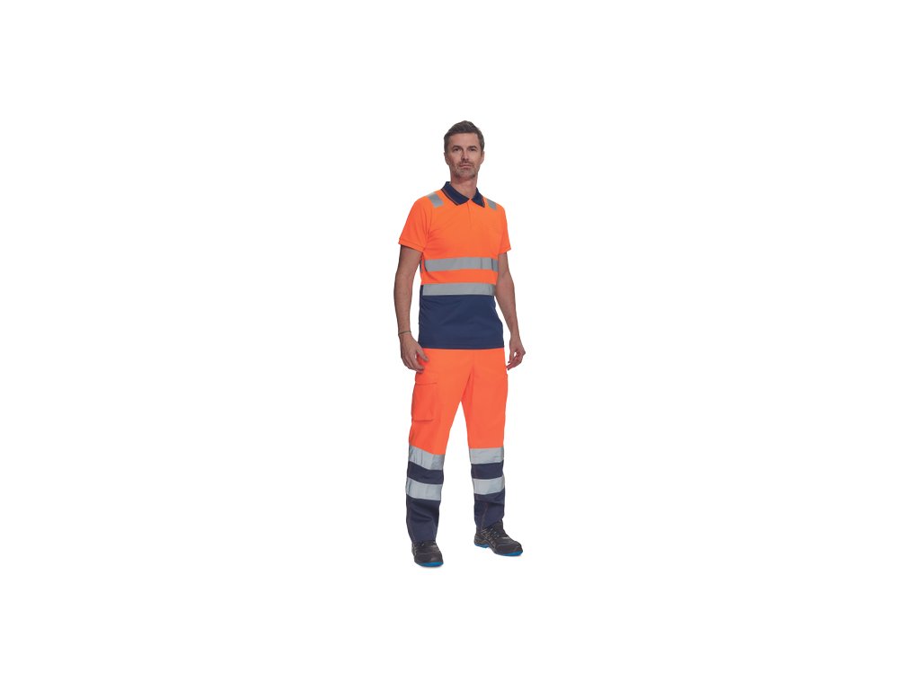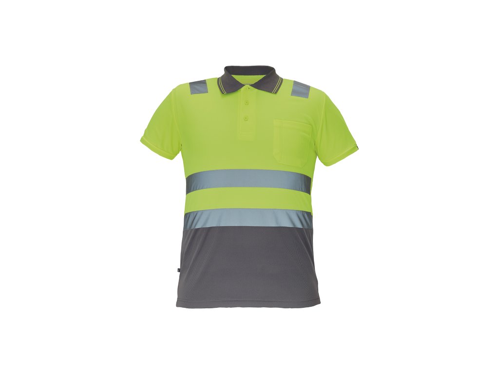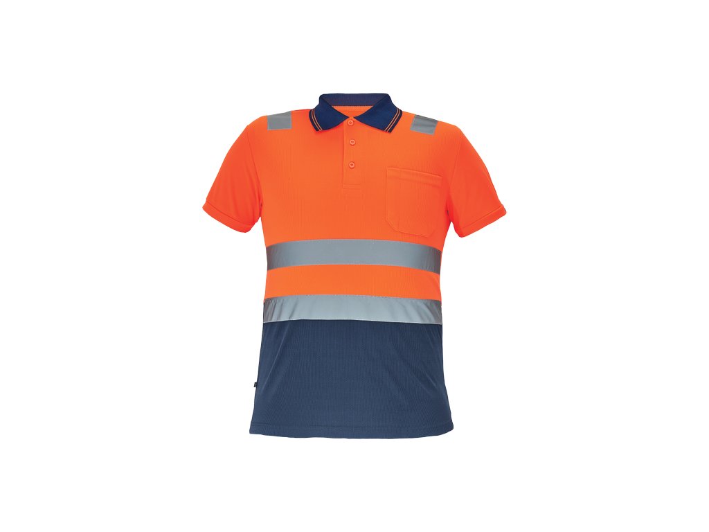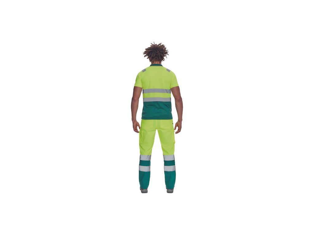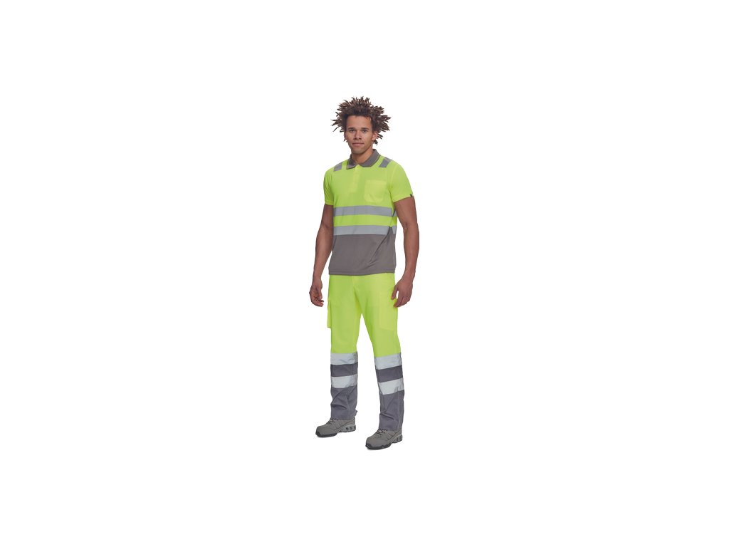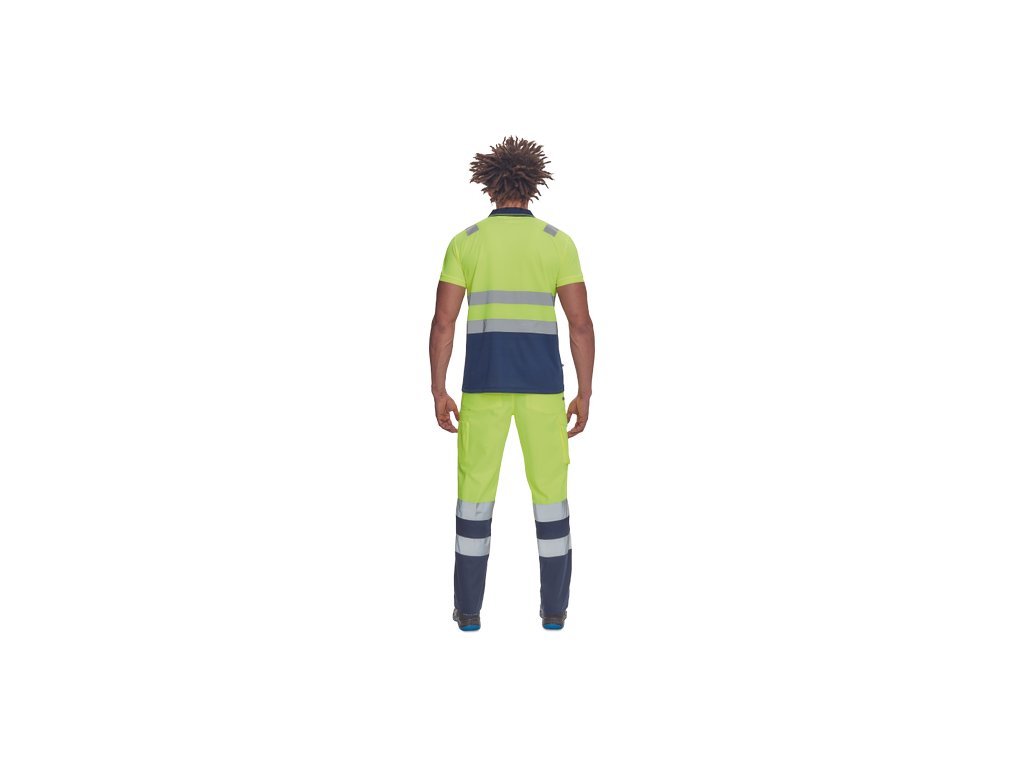 • pánská full HI-VIS polokošile s reflexními pruhy přes ramena a v bocích • zapínání na 3 knoflíky • 1 náprsní kapsička • žebrovaný límeček a lemy rukávů