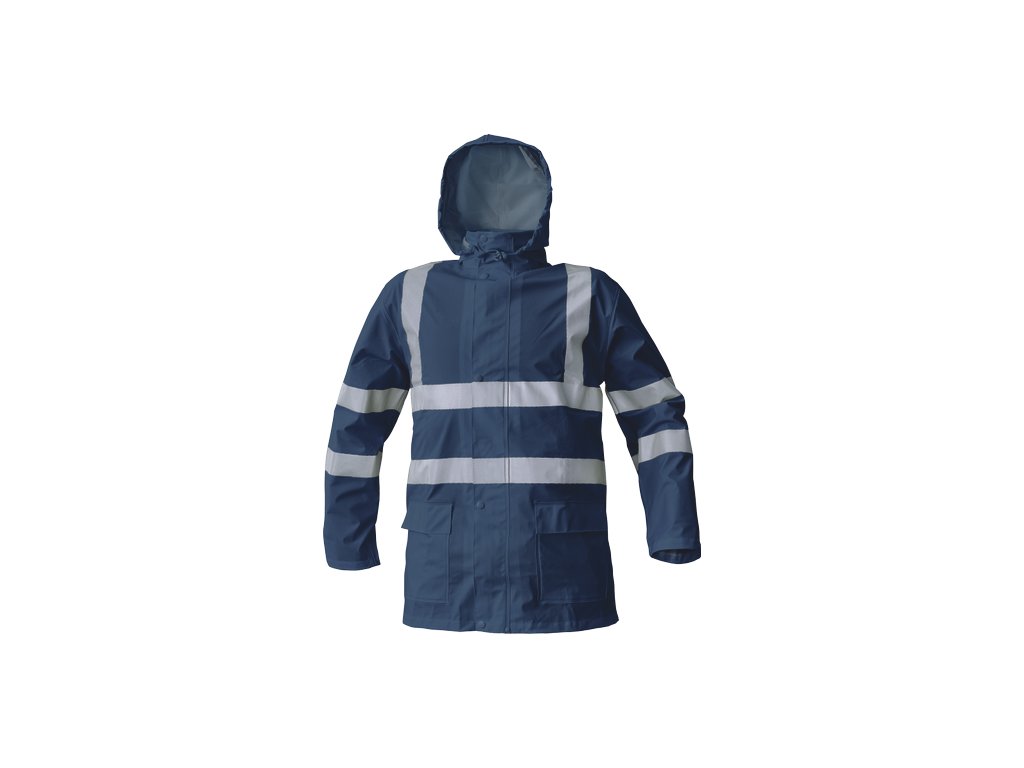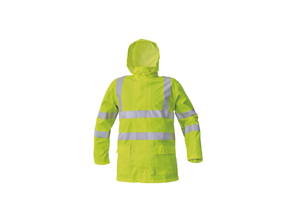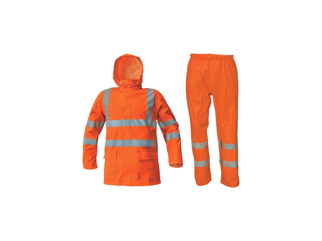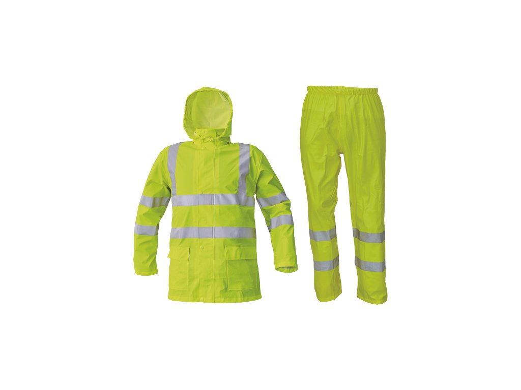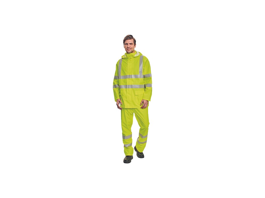 • nepromokavý a větruodolný komplet bundy a kalhot • ¾ plášť s kapucí v límci • kalhoty s gumou v pase • reflexní pruhy bundy po obvodu pasu, boků, rukávů a přes ramena • reflexní pruhy kalhot po obvodu spodních nohavic • dvě přední kapsy bundy kryté légami • spodní lem rukávů lze upravit drukem • HI-VIS provedení pouze ve žluté a oranžové barvě