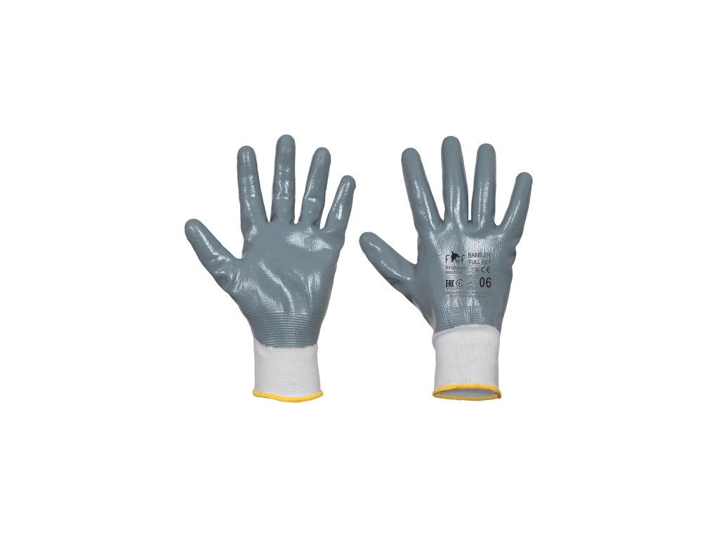 • pletené bezešvé polyesterové rukavice plně máčené v nitrilu