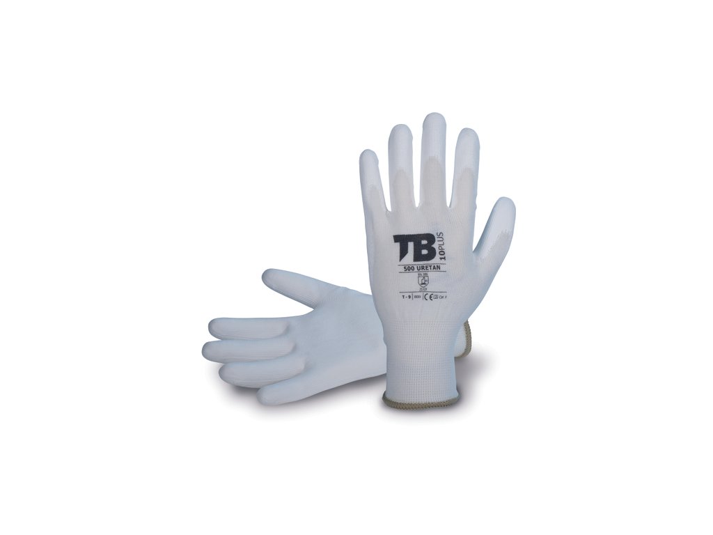 • bílá bezešvá nylonová rukavice máčená v PU na dlani a prstech • speciální PU máčení na kterém se nedrží nálepky (ideální například do skladů) • pletená manžeta • hustota úpletu 13 GG