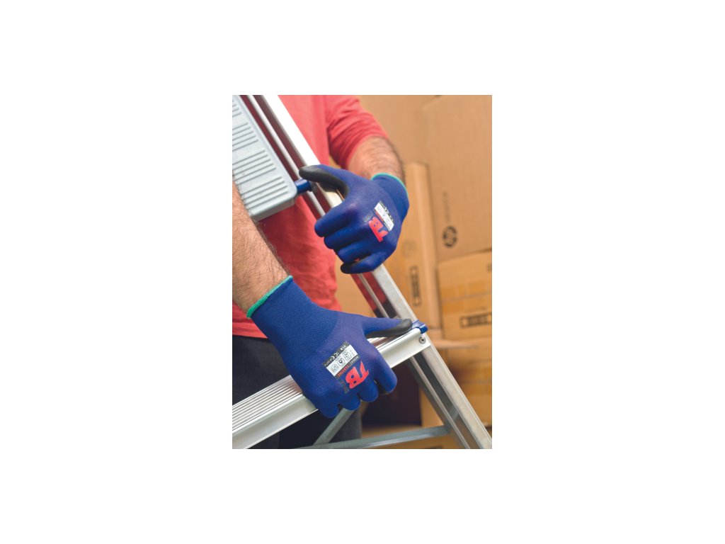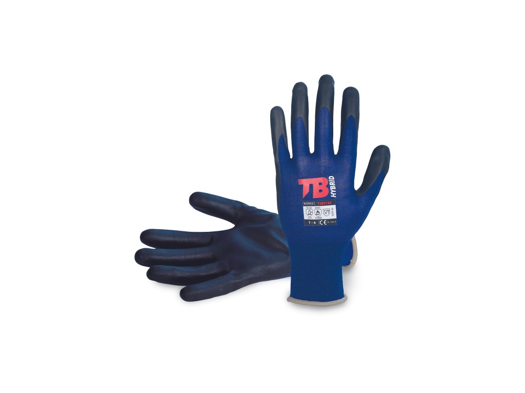 • modré bezešvé nylonové rukavice s uhlíkovým vláknem a elastanem máčené v PPU v dlani a prstech • neobsahují silikon a DFM • pletená manžeta • hustota úpletu 18 GG • odpor = 10^5 Ohm