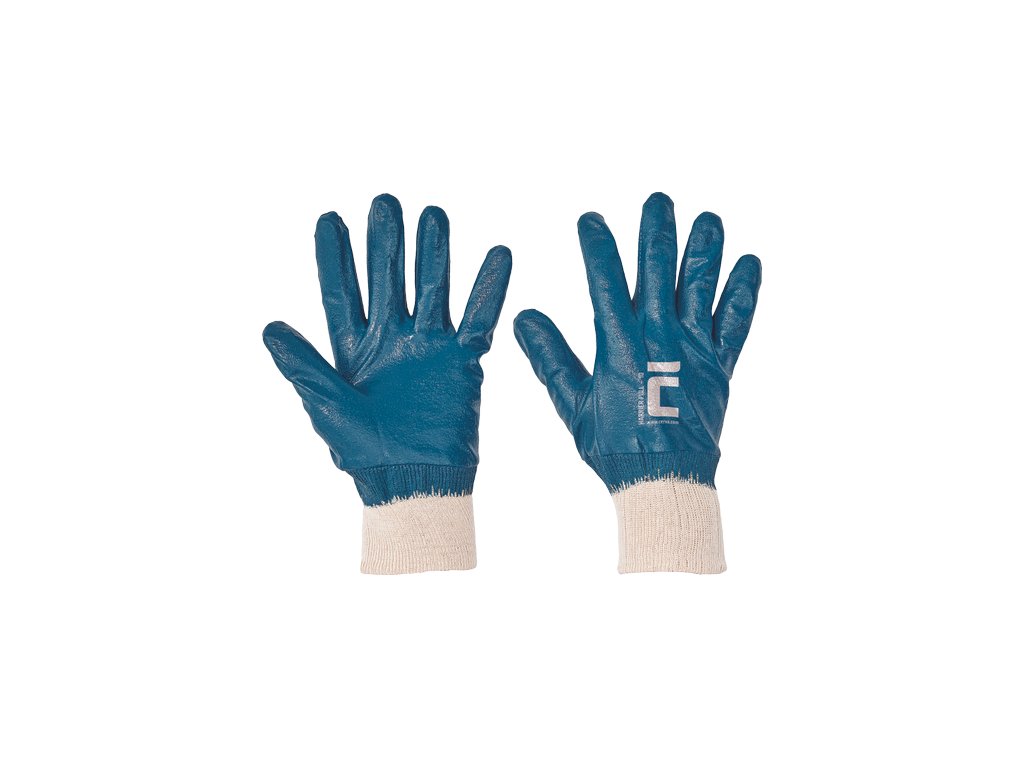 • rukavice šité z bavlněného úpletu • máčené v nitrilu (protismykový úchop) • elastická pletená manžeta