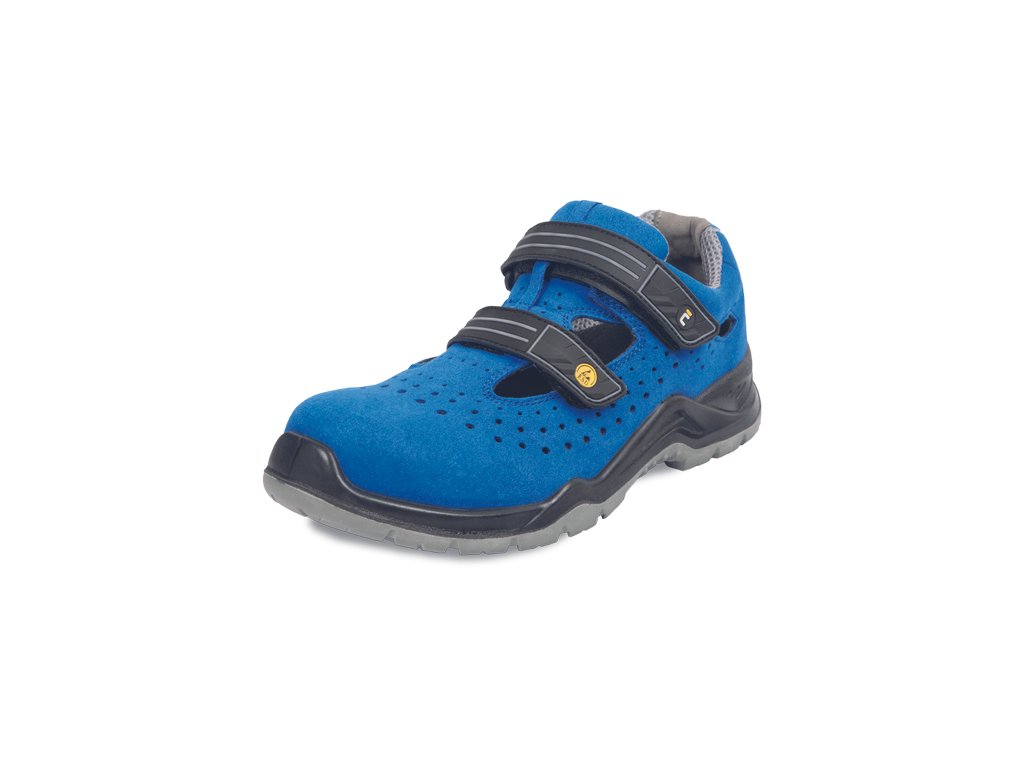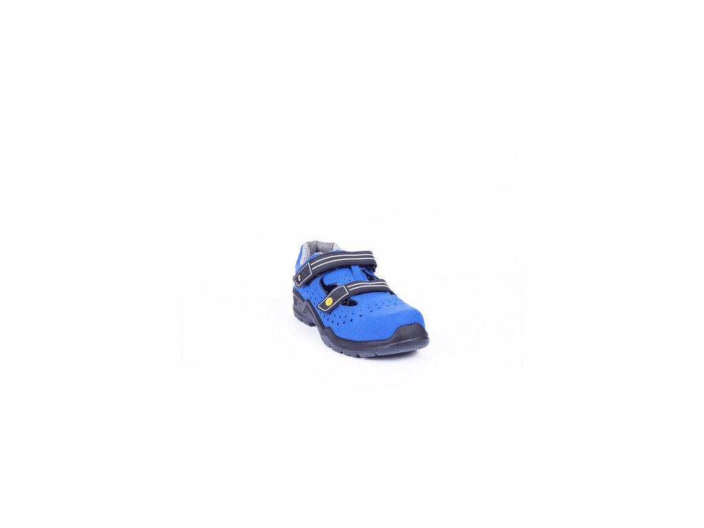 Bezpečnostní sandál v moderní modro-černe barevné kombinaci. Svršek obuvi je vyrobený z mikrovlákna a perforovaný po cele délce. Protiskluzová podešev odolná olejům je vyrobena z polyuretanu a transparentního termopolyuretanu. Podešev zajišťuje nejenom komfort ale také maximální jistotu při každém kroku. Obuv je vybavena komfortní, perforovanou vnitřní stélkou, která garantuje pohodlí a cirkulaci vzduchu uvnitř boty. Absorpce energie v oblasti paty tlumí nárazy a omezuje pocit únavy nohou. Díky bezpečnostní kompozitní tužince splňuje obuv požadavky normy EN ISO 20345:2011. To znamená, že chodidla jsou chráněna před stlačením silou do 15 kN nebo pádem břemena o vaze do 20kg z výšky 1m. Chodidla jsou chráněna také ze spodu a to díky kompozitní stélce proti propichu. Obuv neobsahuje kovové součásti a je vybavena funkcí ESD. Proto je to ideální model pro vnitřní prostory a citlivé prostředí, kde je potřeba zabránit vzniku jisker z elektrostatického výboje anebo pro prostory vybavené bezpečnostním rámem. Obuv bude vhodná pro zaměstnance s vysokým nártem, protože díky velice pohodlnému zapínaní na suchy zip je možné přizpůsobit svrchní část obuvi přesně na míru a tímto dosáhnout maximálního komfortu během práce.