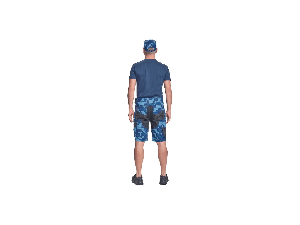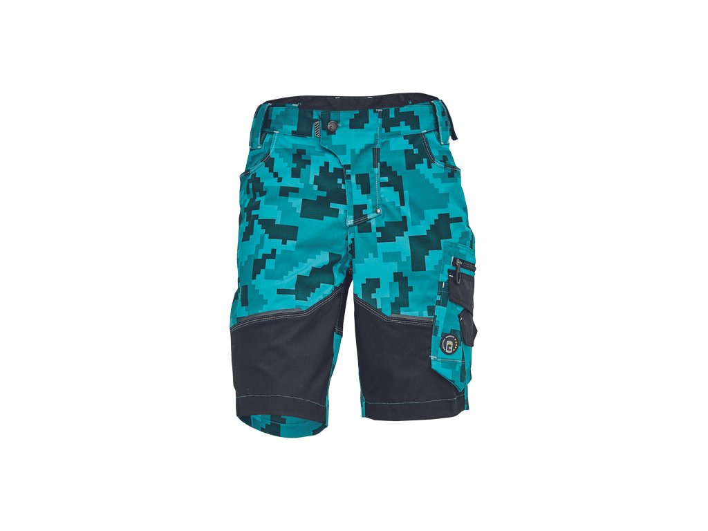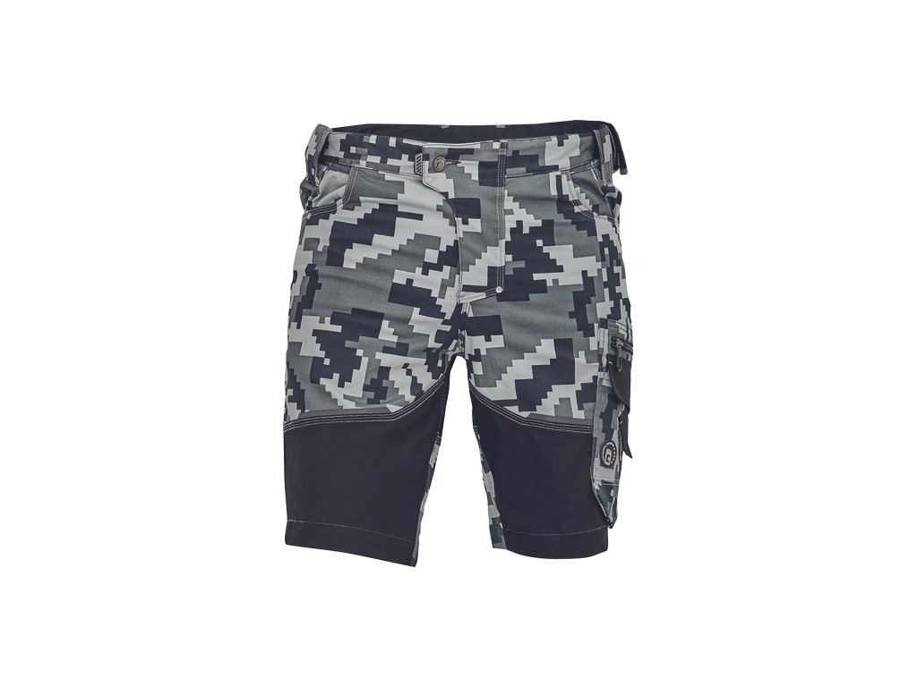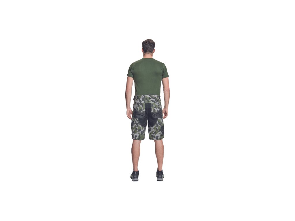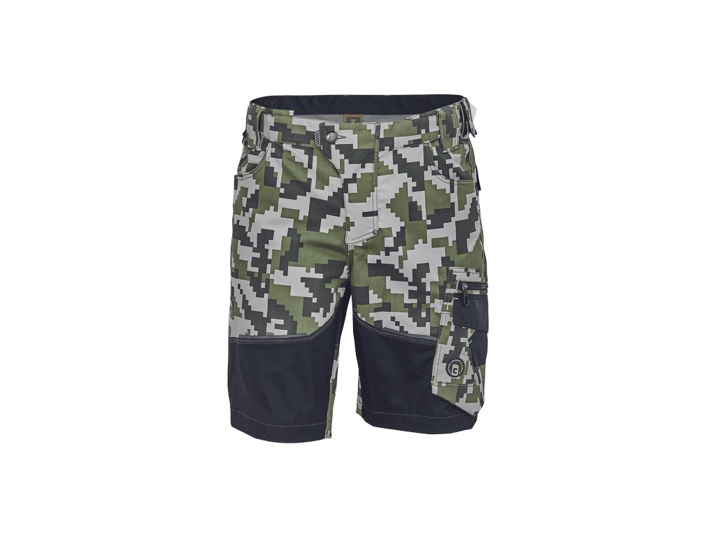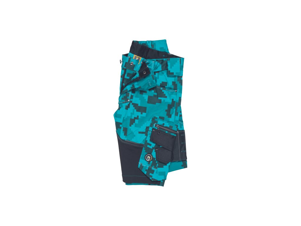 • pánské pracovní šortky s pružným pasem • elastický inovativní materiál Trifibetex® v kamuflážovém potisku • odolné trojité prošití nohavic a sedu • 2 boční kapsy • 2 zadní kapsy • 2 multifunkční stehenní kapsy • reflexní prvky v barevném odstínu
