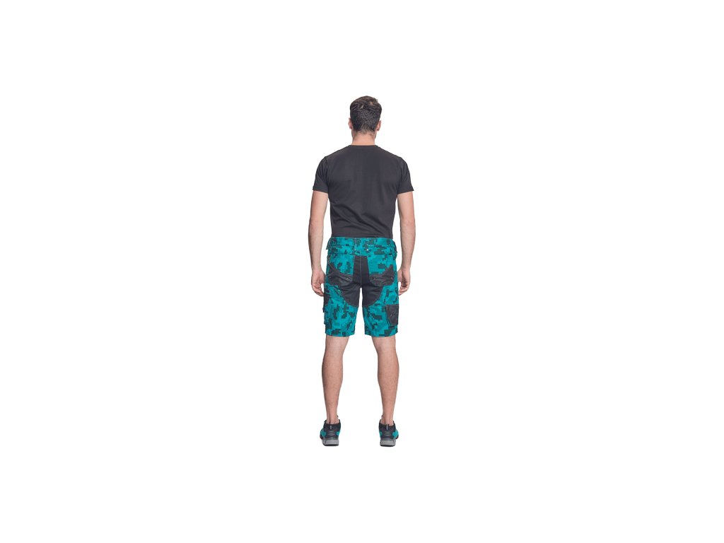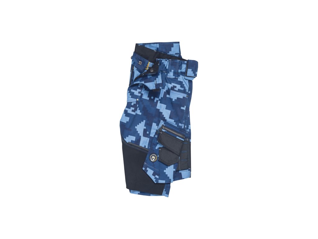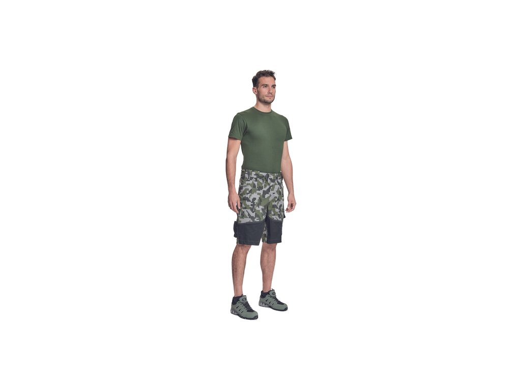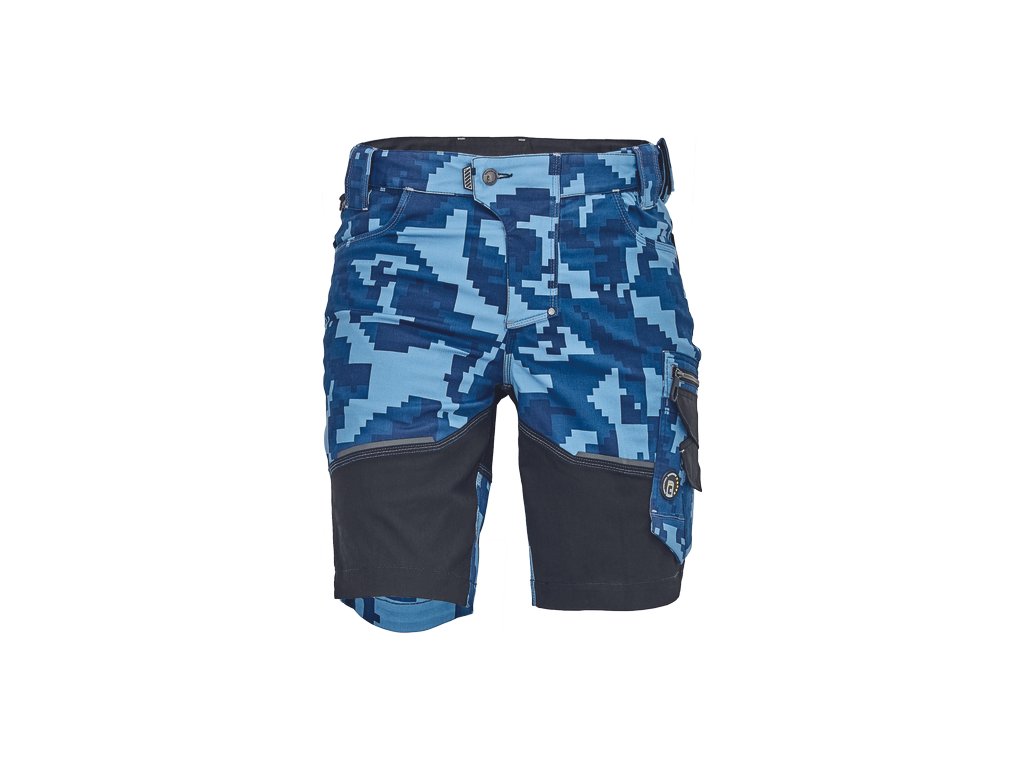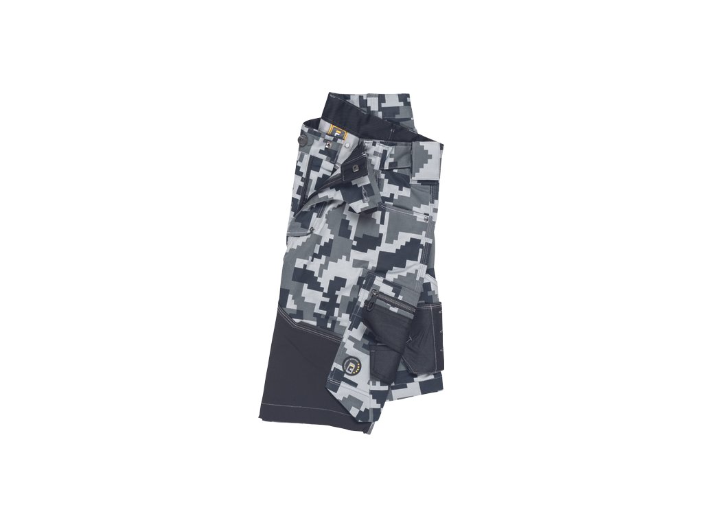 • pánské pracovní šortky s pružným pasem • elastický inovativní materiál Trifibetex® v kamuflážovém potisku • odolné trojité prošití nohavic a sedu • 2 boční kapsy • 2 zadní kapsy • 2 multifunkční stehenní kapsy • reflexní prvky v barevném odstínu