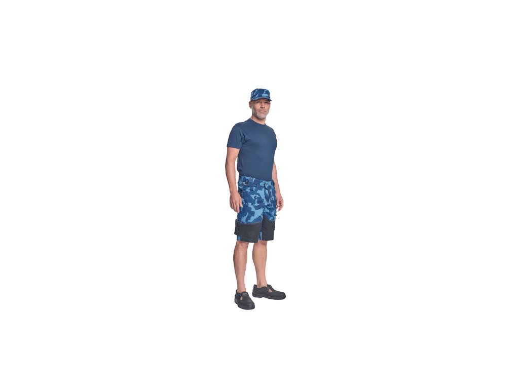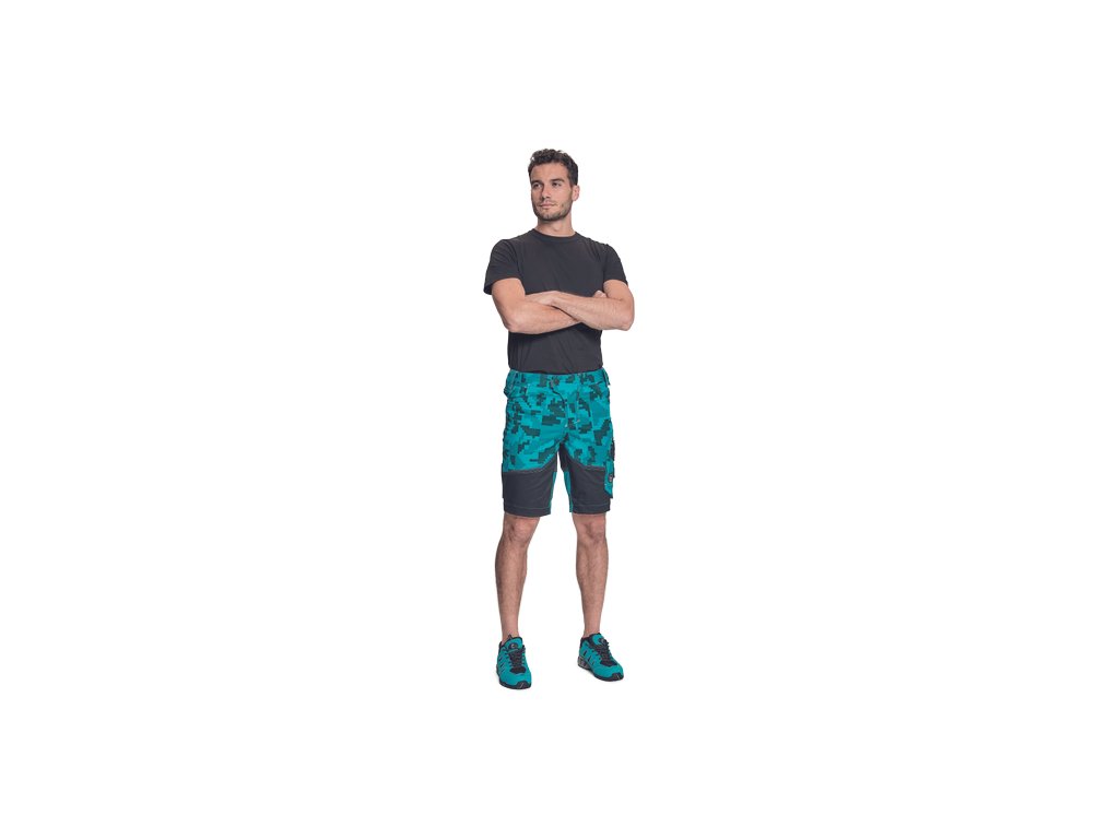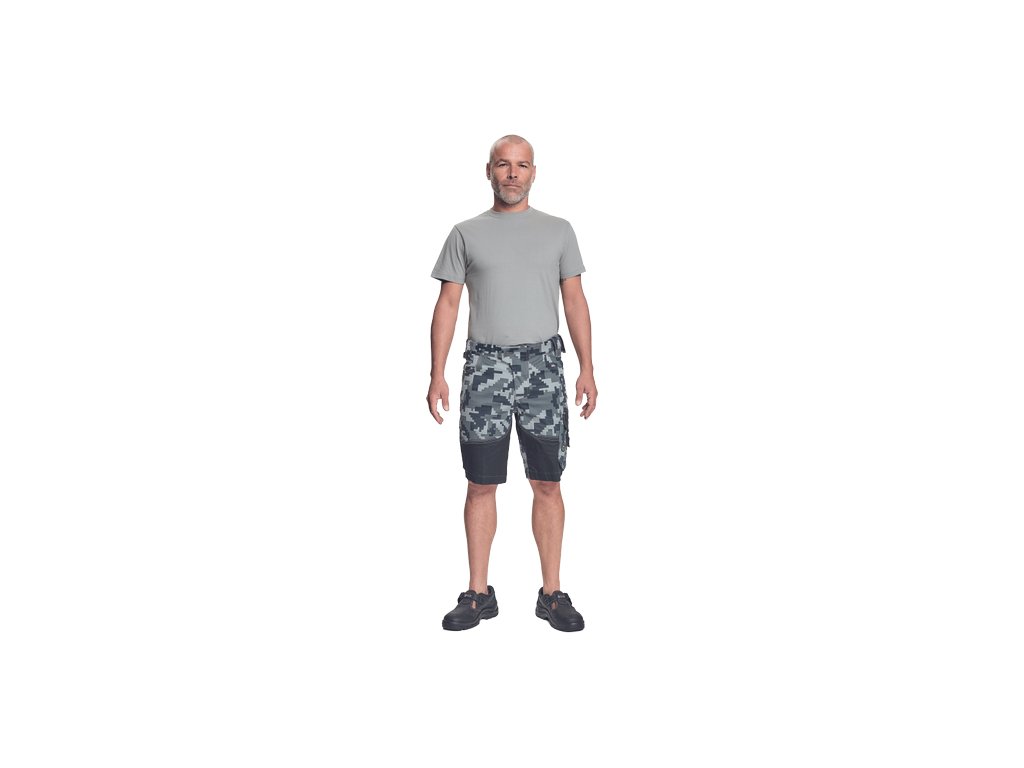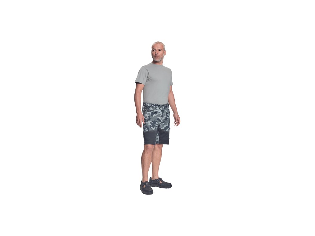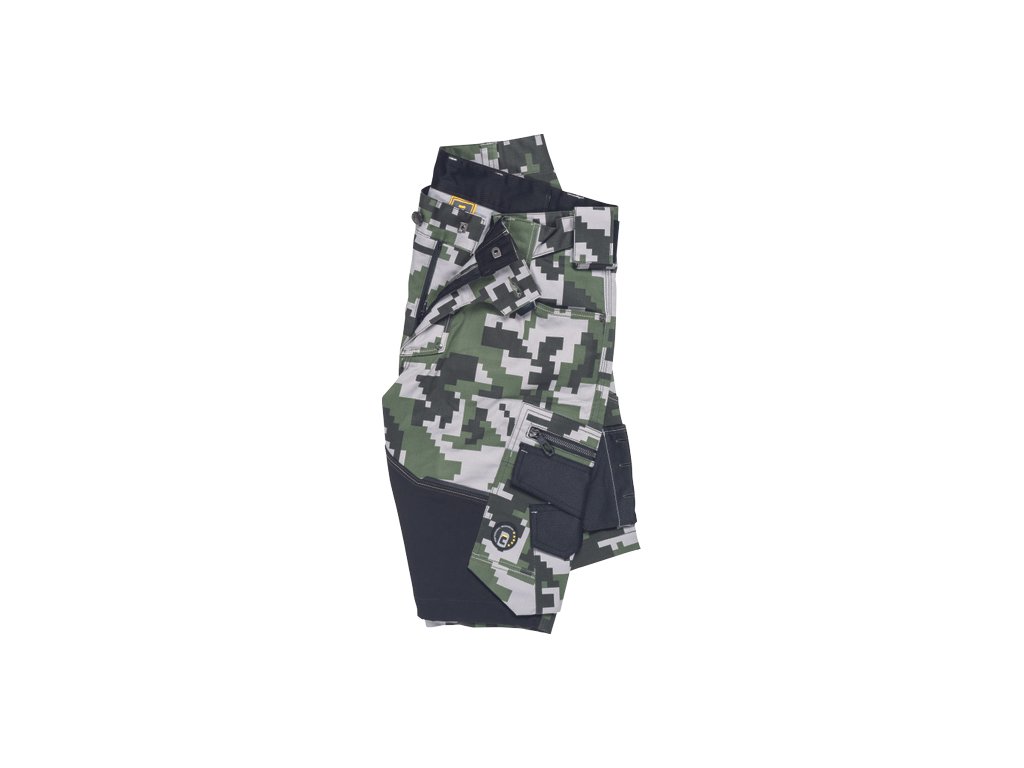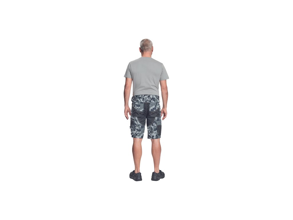 • pánské pracovní šortky s pružným pasem • elastický inovativní materiál Trifibetex® v kamuflážovém potisku • odolné trojité prošití nohavic a sedu • 2 boční kapsy • 2 zadní kapsy • 2 multifunkční stehenní kapsy • reflexní prvky v barevném odstínu