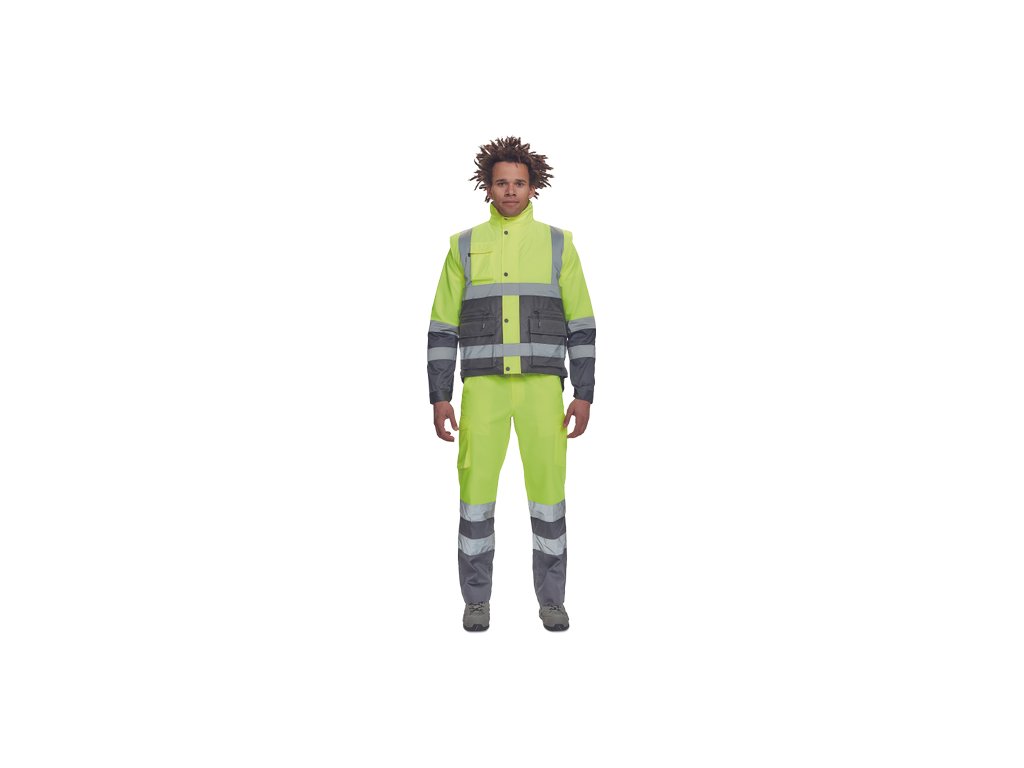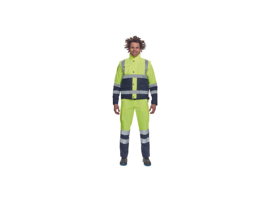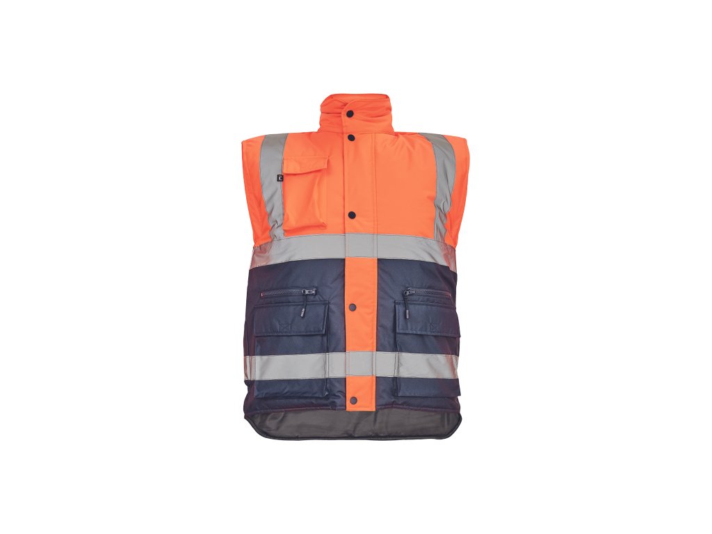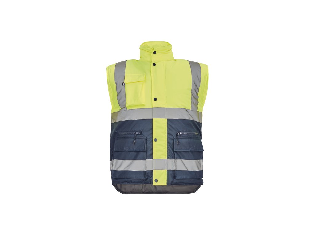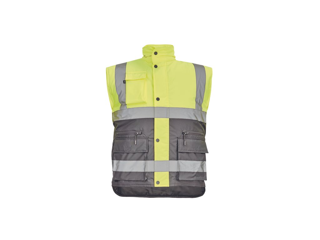 • pánská zateplená HI-VIS vesta s reflexními pruhy přes ramena a v bocích • kapuce skrytá v límci • zapínání na zip kryté légou se zapínáním na druky • 2 přední multifunkční kapsy s klopou a zapínáním na zip • 1 náprsní kapsa s klopou