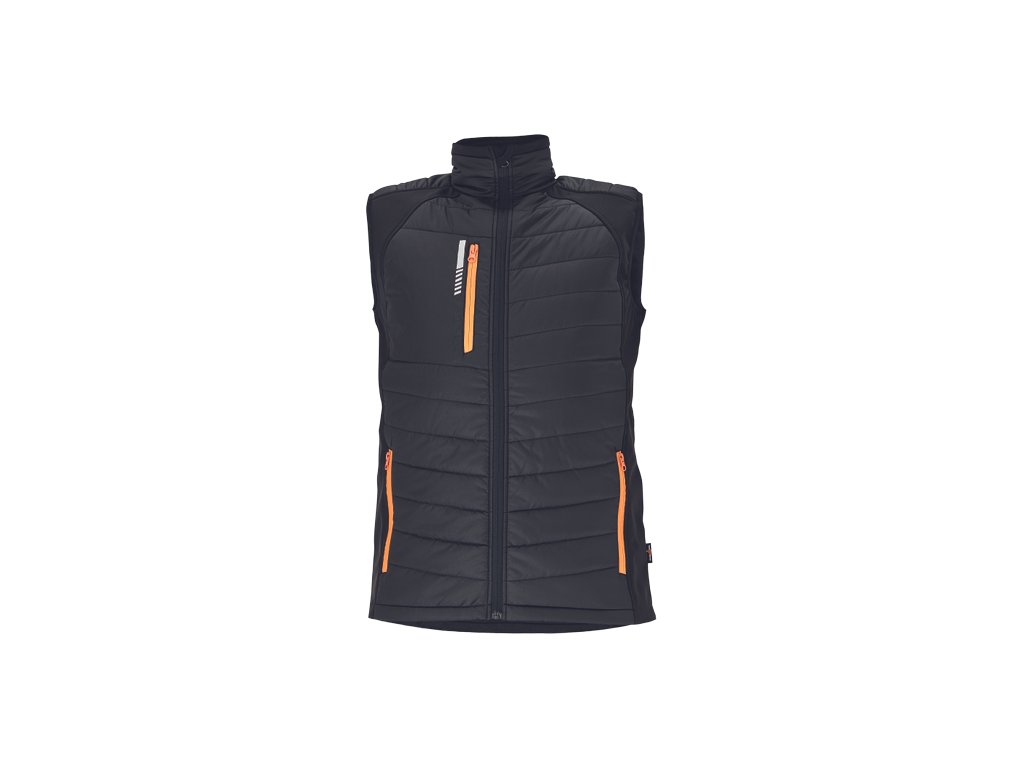 • zateplená vesta s výplní • postranní kapsy na zip v kontrastní barvě • 1 náprsní kapsa na zip v kontrastní barvě • celozipové zapínání • elastické průramky